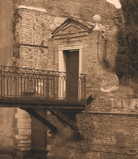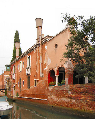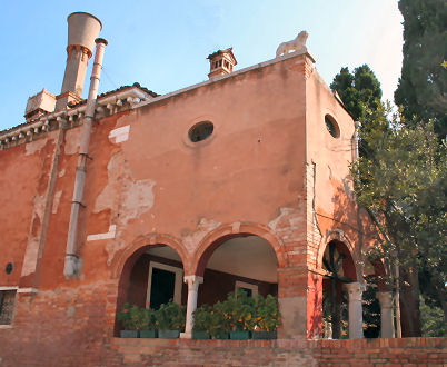on the bell push. A few years ago an article appeared in the gardening magazine Hortus (Autumn 2003) by John Hall, who had actually managed to get inside the garden on a winter afternoon. He reports that, unsurprisingly, of Eden's high-upkeep original structures very little remains. He paints a picture of neglected paved courtyards, dilapidated pergolas and fallen statues that does nothing to lessen the mystery and romance. "One bare and forlorn trellis-pergola ran down the centre, from nowhere to nowhere. Statues remaining on their piers were not properly aligned, others lay on the ground. The old Istrian stone water gate onto the lagoon, with niches and statues on each side, lay broken on the ground." He also came across the graves of Eden's dachshunds and found "where Hundertwasser lived, an open stone conduit leading from his WC inside ended poised over the first of a descending series of stone basins - his personal ecological sewage system". Some recent rumours have it that it had been acquired by both a Japanese Company and a Swiss Corporation, but it seems that it's still owned by 'people' from Vienna and regularly visited by their gardener. The Giardino Edino was classed as a monumento nazionale as far back as 1945 and so let's hope we get to see inside it one day. Until then it lives in ruin in our imaginations. We do now have Google Earth, though, and so in the image below you can see the extent of the place (bottom right) with the gleaming church of the Redentore (top left) included so that you can place it.