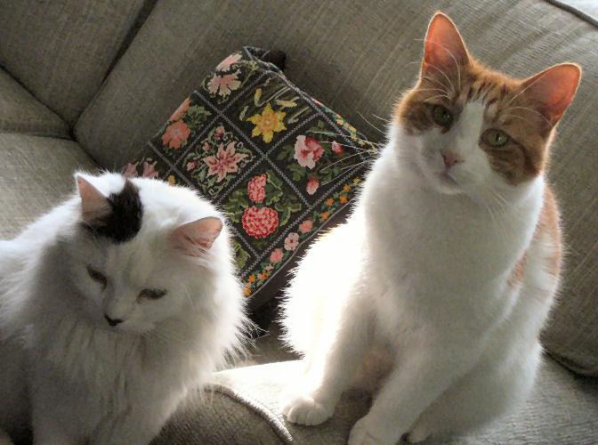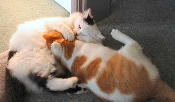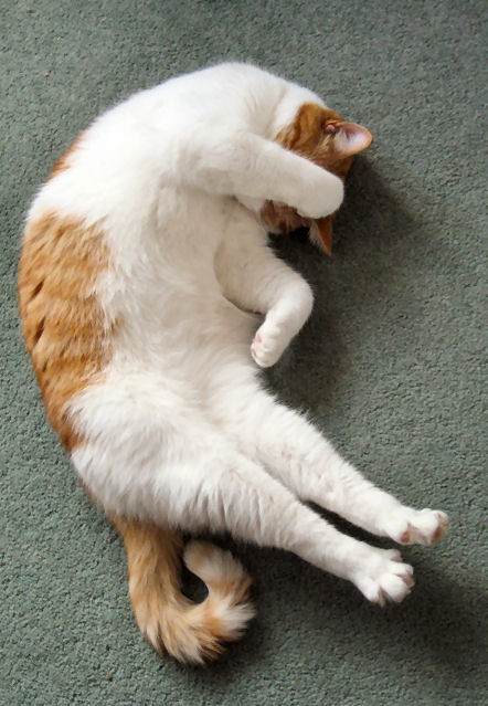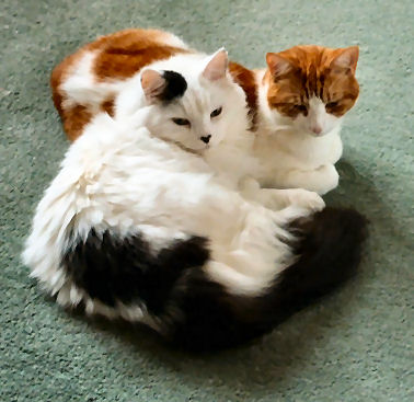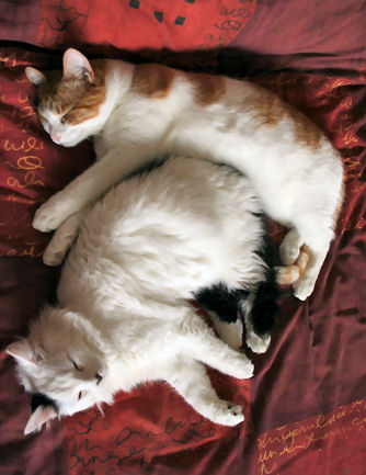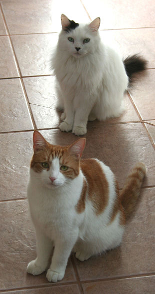 Saturday 7th October 2006 Our much-loved cat Louis had passed away in March, and after the period of mourning that all cat owners will understand we were up for some new fluffy chums. Holiday and house-sitting commitments in September had to be got out of the way, and then it was a matter of some phone calls to those wonderful people at the Cats Protection League, and a home visit arranged by our local branch to vet us, if you see what I mean. Which all lead to our visit to the Purley Cattery to choose Oscar and Peter. They were strays found together and given their names by a woman in Thornton Heath. We weren't sure about the names, but having realised that the names are suggestive of Oscar Peterson, the jazz pianist, who my dad liked, and what with Louis being suggestive of Louis Armstrong, we're warming. Peter rewarded us with a large crap in his new basket not minutes out from the cattery, necessitating a stop by a park, with a bin, on the Purley Way, and I had to have him on my lap in the back of the car for the rest of the journey so my jeans got...well too much detail maybe. We were advised to keep them in one room for a few days to let them become acclimatised and leave their scent. So we took them into the front room and they both disappeared behind the sofa. We had lunch and sat quietly reading the papers with the cats still behind the sofa. Peter emerged pretty quickly, establishing himself as an affectionate and loudly-purring (like a freight train) and lap-sitting cat. Feeding we left maybe a bit late as Peter tucked in furiously, simultaneously chewing and growling if Oscar came up to the other bowl. So we put the other bowl behind the sofa with Oscar. In the evening I watched a DVD with Peter on my lap (sweet!) and realised Oscar had emerged to sit on the floor by us. I got in a stroke and a chin-skritch, but he dashed back behind the sofa when I stood up. Sunday 8th October Much the same behaviour from both cats today, with Peter becoming very confident. Some cat-loving friends came and he was out with us, and playing with them, for the whole visit. Later I fed the two cats some biscuits after watching a DVD with Peter sprawled on my lap. And, sitting on the floor as they finished, was rewarded with more tentative contact with Oscar, and even some purring, and Peter grooming Oscar's head and then even some grooming/fighting play, not involving me. Monday 9th October Knowing that a postman would be coming to the front door (and I'd have to open it) in the afternoon I waited until he'd come and, at feeding time, left the door to the front room open. They both ate and then Peter (who'd made a dash for freedom last night and got up two flights of stairs before I scooped him back) went and sat on the sofa and watched as Oscar finished his food. And then Oscar went out and explored! When I poked my head around the door he scampered back and hid behind the sofa again. As I type I'm awaiting developments. And as the evening progressed there was more bravery displayed in house exploration, with Oscar pretty brave, but he's yet to venture upstairs. Food and eating, as is ever the case, offer the best opportunities for luring and bonding. Tuesday 10th October Freedom for Oscar now seems to mean a different room's sofa to sleep behind, and after joining me for breakfast, Peter's just joined him. This is all going to take time, I can see. Going down to have something to eat at 7.00pm, I find them both out, and waiting. They eat and wander off, but not behind sofas. After I've eaten I go and sit in the front room to watch some TV. I get Peter on my lap and Oscar curled up next to me. Aaaah! Then Oscar actually goes off upstairs exploring. More progress. Later whilst watching a DVD (A Prairie Home Companion - tedious!) Oscar comes up on the sofa and starts kneading my thighs, but no lap-lounging yet. |