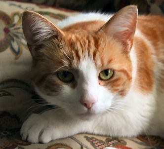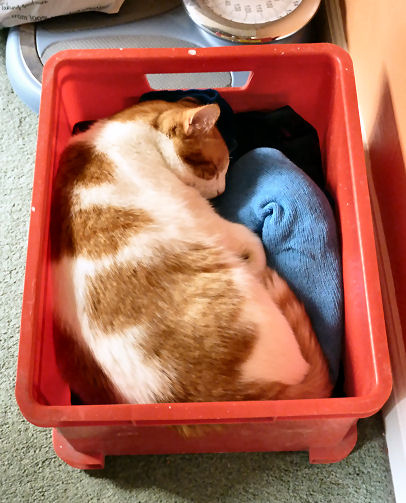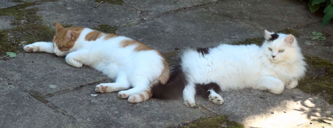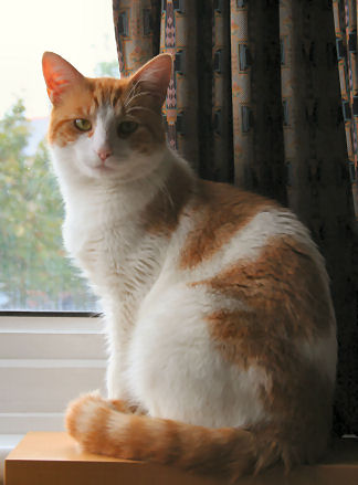 Wednesday 11th October Oscar disappears after his breakfast, but Peter's still out and about when I wake up and come down for mine, and sticks with me, even while I come upstairs to the PC. As I type he's on the window ledge watching the torrential rain. Continued dingy weather is preventing the taking of any more pics, but the sun did come out a bit (see right). A good acclimatisation-progress day today, with Oscar emerging more and Peter seeming more nervy, for some reason - even becoming spooked by the dishwasher. Both seemed OK with the thunder, and (wondering about their lives previously) both seem to know what a fridge is and what cans can contain - shame it was baked beans in this case. Thursday 12th October The first day that both of us were out at work all day. They seemed to cope - I came home to two cool cats, not immediately weaving around my feet and pleading to be fed! Well, not until I'd taken my coat off. Now they've come upstairs, but they're being pretty patient. Cool! OK, I'll leave off with the daily stuff and get back to you later when Oscar poses in daylight a bit more. The next big step is letting them out into the garden, which we were advised not to do until we'd had them indoors for a few weeks. Hoping that this has been cute and/or educational. |