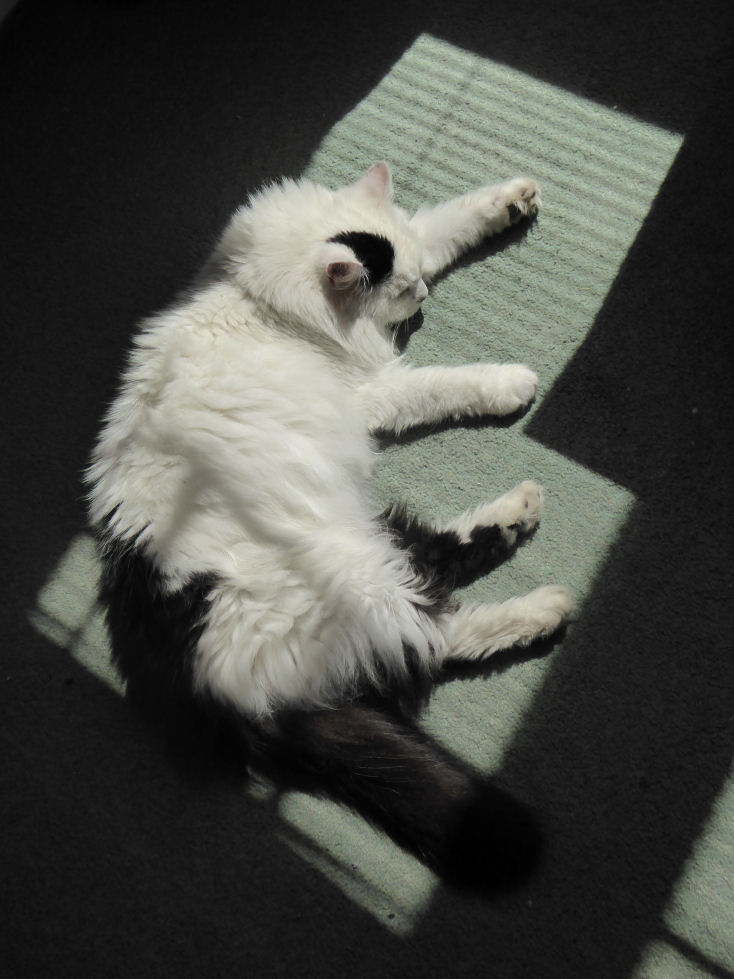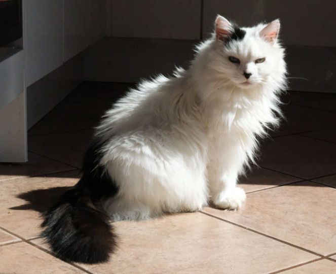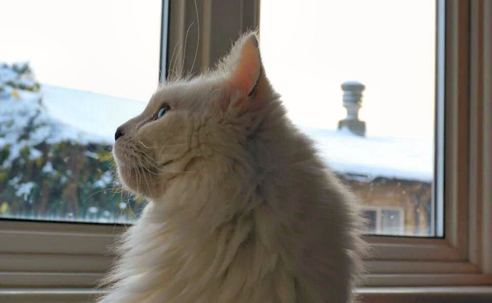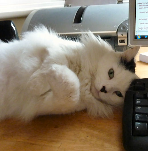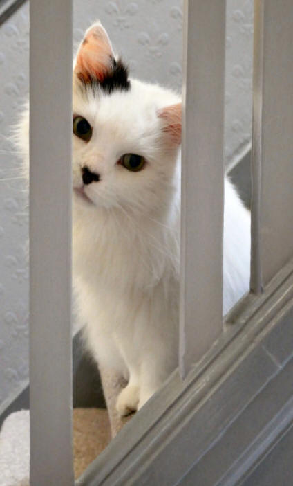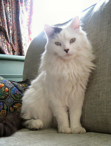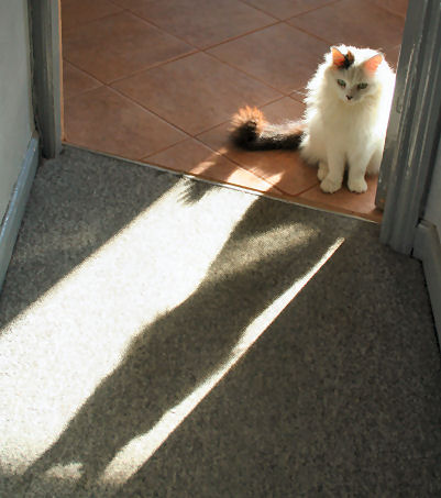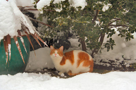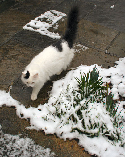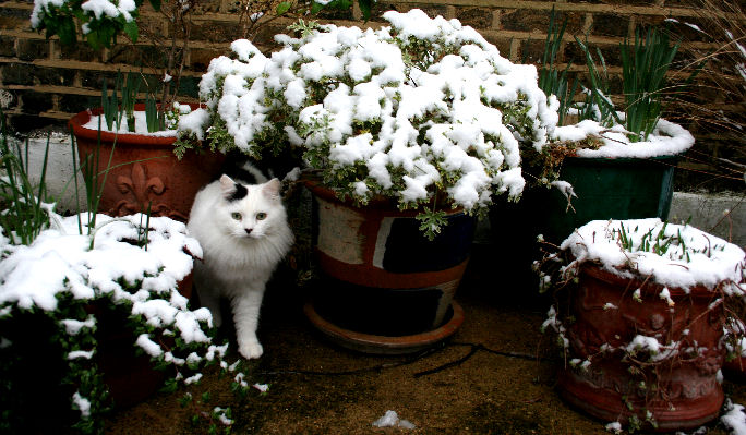 24th January 2007 Some cold morning pics of a white cat in the snow, taking advantage of a rare fall, what with global warming and all. The boys continue to become more settled, and less likely to compulsively gobble their food in one go. Also Peter is becoming more talkative, in fact a bit of a plaintive squeaker, especially when he's happy to find you after thinking he's been left on his own. The garden is now well and truly their territory, and they've not used the litter tray indoors in weeks. Hallelujah! ![]() |