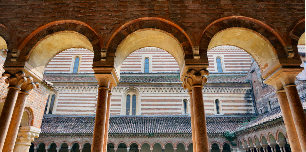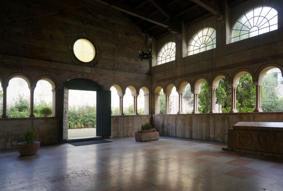 For my last full day it was a toss-up between staying in Verona doing some more churches or a day trip to Mantua, which I'm due to visit on a tour next year. The staying-put option won. Less than a minute from my hotel is Santa Maria della Scala. A service was on so I just snuck in the back and took in an interior almost totally remodelled after WW2 and with the spiritually enhancing qualities of a railway station. Opposite is San Nicolò, which is large and baroque, nicely proportioned and airy inside and has a neo-classical facade grafted on in the 1950s, it having been taken from a church called San Sebastian, all but destroyed during WW2. Passing the Arena and going through the city walls I found myself in the somewhat charmless Cittadella area. In a square with many modern banks and a drive-through Burger King I tried to find a church marked on my map. I found it, with a cat stalking though its manicured graveyard, and discovered that it was now a bank too. All of which made finding the very lovely church of Santissima Trinità a much needed infusion of charm and old frescoes. It has a sweet cloister-like entrance atrium (see right), is long and stony inside with characterful 14th Century frescoes, and also later frescoes and altarpieces by the ubiquitous Brusasorci. I