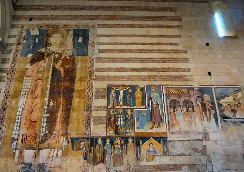 there next.My evening stroll started out as a vague finding of churches in a direction I'd not walked in before, and ended up with visits to two. San Giovanni in Foro is small and seems to be very used. It has some modernish art and even some excavations, so seemingly a church of ancient foundation. Then I found Sant'Eufamia, a big wide church, but aisleless (see right) and continuing the day's theme of layers of fresco fragments. Also unlabeled and unlit altarpieces by names come across of late, like Caroto, as well as Stefano di Francia. For tonight's post-junkfood gelato I decided to try a semifreddo, which is what us Brits would call a wafer, but it's square. And in this case almond-flavoured. Very nice.