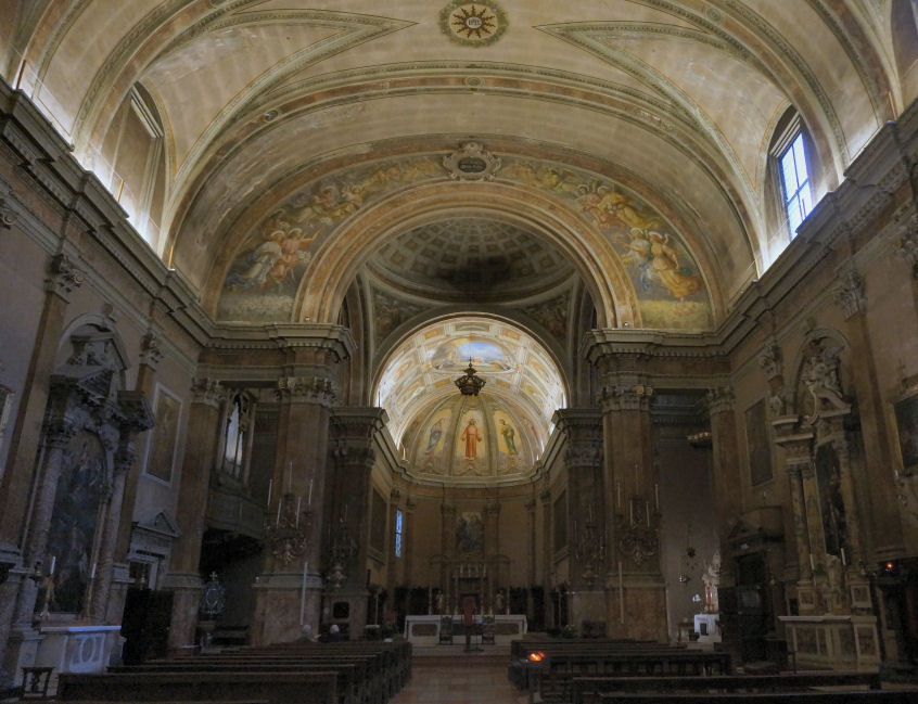 pastel-coloured new frescoes in the dome and lateral thingies, by Brusasorzi, with much older and darker bits on ground level. And has a
