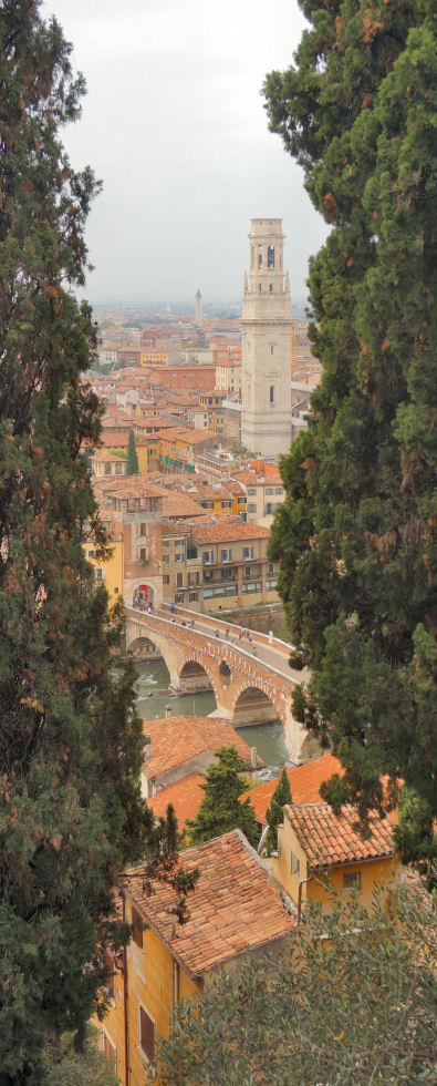 An undisturbed night's sleep, the only disturbing aspect being that I woke up in the wrong half of the room's double bed. Never done that before. Breakfast choice impressive - to suit me there was good fresh orange juice, comprehensive muesli selection (with solo ingredients to tailor your own), a range of really fresh fruit, a vat of plain yoghurt and a choice of croissants - filled, plain, wholemeal and salty! I'll stop there, but suffice to say - no complaints. Being out a bit early (before 9.00!) I took myself to the area around the Piazza Erbe and the Palazzo del Comune for some relatively unpopulated photography. And church number one, Santa Maria Antica, the one overshadowed by the extravagant Scaligeri monuments. Inside it's all rough stone, buff and antico with some stripey brickwork. Next was Sant'Anastasia where I bought a three-day Verona pass and a plush guidebook to the big four churches (which charge entrance). This is the biggest church in Verona and has some