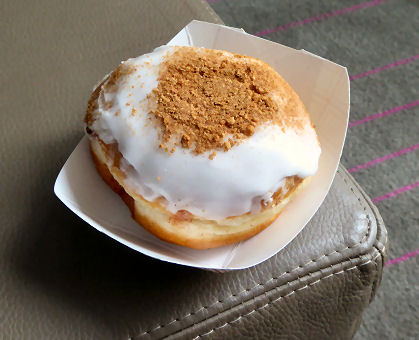 late.) Getting an iced apple and cinnamon doughnut - called a Molly Malone