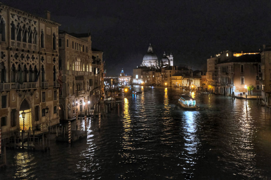 strolling along the Zattere in the dark, taking photos during a wander back.