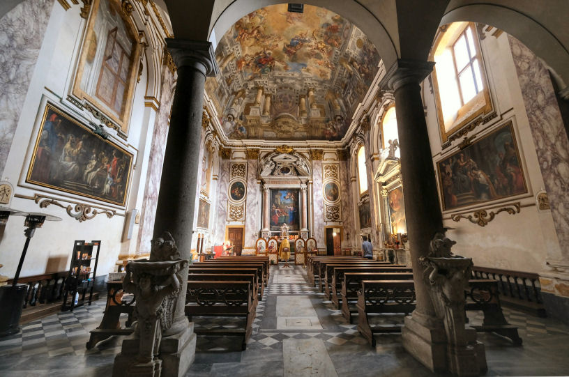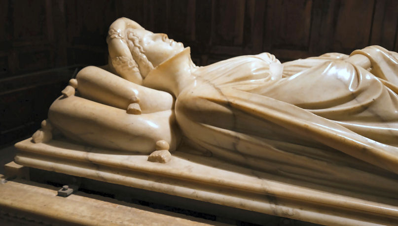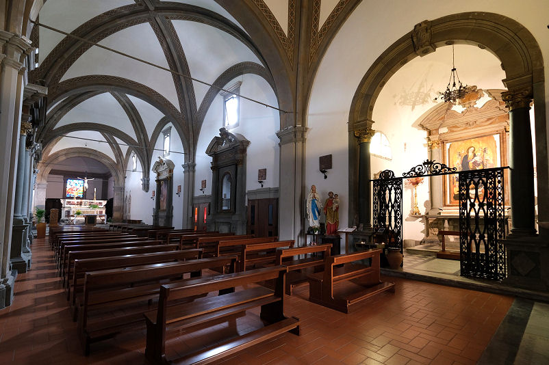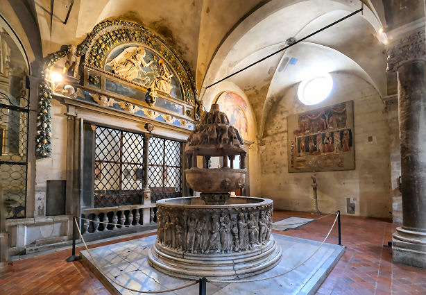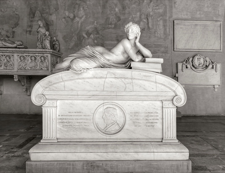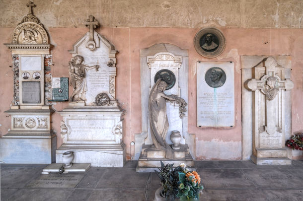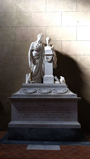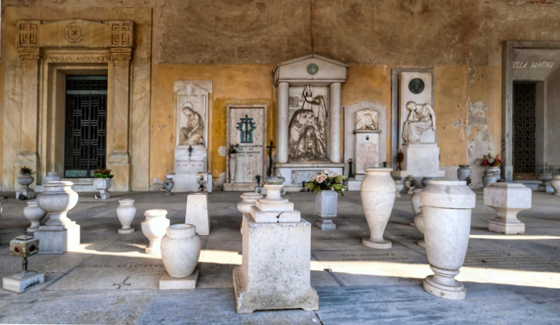 below. Lunch was a mozzarella and tomato panino, with lime and pepper crisps, taken back to the hotel and eaten on the first-floor terrace. Tea was then taken in my room before my traditional siesta. Afterwards I walked the top of the wall clockwise as far as Piazzale Verdi and then came down to ground level to find some churches. San Frediano was open and I had an hour, but it was not long enough. It's a Romanesque asymmetrical treat with odd chapels and views, and was a joy for not being busy at this time of evening. The best bit is, arguably the unusual four-bay baptistery, with two more chapels beyond, (see far right) containing a fine 12th-century font with reliefs of the story of Moses, with an odd-shaped cover. Behind it is a lunette of the Annunciation by Marco della Robbia and two fine fresco fragments. A 19th-century monument, to Lazaro Papi. provided an unusual highlight (see right) in the evening light. After more warm walking east I ended up in L'Oste di Lucca with a pizza bufala with basil and onion and a malty Moretti La Rossa. The bill had to be paid in the sophisto food shop next door, which was odd. In the evening my room benefited from the sound of a nearby brass band. Friday 9th To the church of San Michele first, One of those roughish barely-decorated well-used city centre churches, but old and pretty unrebuilt. On the inner facade is a nice 14th century fresco of the Virgin and Child and to it's left in the corner is a worn Virgin and Child statue made for the façade by the ubiquitous Matteo Civitali, but replaced outside with a copy. There's also a terracotta relief of the Virgin and Child attributed to Luca della Robbia and a Filippino Lippi panel of four saints which doesn't fit its decorated niche well, so I guess it wasn't painted for here. Heading west and ticking off some more closed churches I ventured outside the walls to find the city cemetery. It doesn't have the reputation of the likes of Bologna and Verona but it did not disappoint. I had a good hour there but it was hot and I was somewhat unnerved by the place closing for lunch. So I headed back, through a different, and worryingly deserted dank and labyrinthine entrance through the wall, picking up a mozzarella and tomato panino and some pear and yoghurt sponge. Afterwards I went the opposite way around the walls, so got to San Frediano quicker, for a second visit, and the nice man accepted my ticket from yesterday. Another hour was spent inside and San Frediano is set fair for a Best Church in Lucca award. Odd fresco bits, asymmetrical layout, odd chapels and a mysterious Roman pillar - what's not to like. Carrying on anti-clockwise around the mura urbane I came down to ground level and wandered, buying some expensive pear jam and mostardina toscana, and eating at La Piadineria. Their Levante was grilled veggies, hummus (crema di ceci), tomato and rocket in a folded circular flatbread, and molto tasty. Saturday 10thThis morning I made for a couple of churches I was told would best be investigated on a Saturday, Angeli Custodi and San Francesco, and my luck was in. On my way I found Santa Maria Fuorisportam open and it had the usual Lucca grey stone interior, fresco fragments, a strigillated Christian sarcophagus adapted as a font and placed in a decorated niche, and two altarpieces by Guercino. It also has a somewhat dominating 19th century tomb in the north transept of one Antonio Mazzarosa (see detail right), a reformer and writer who died only a few weeks after unification. The oratory of the Angeli Custodi had been described to me as 'a scream' , and it did not disappoint - a small barrel-vaulted church, but with the walls, the apse and it's arch all hugely covered in mind blowing large-scale trompe l'oeil frescos, with masses of putti, angels and garlands (see right). San Pietro Somaldi looked open but a red rope a cross the door and big flower action inside presumably presaged a wedding. San Leonardo is a sober pale green box inside, with dark blue vaulting and marble pilasters, but has a surprise large circular chapel, handsome like the best funerary chapels in monumental cemeteries, and presumably is 19th century too. San Francesco is a bit plain too - big long bare box, stripped down and cleaned up for concerts, with an impressive altar-like tomb of a bishop, with the more modest wall tombs of composers Geminiani and Boccherini opposite. The chapels either side of the apse/choir (bare but with stalls) have some nice fresco remains, but that was about it. ![]() The Villa Guinigi art gallery nearby was opening at 12.00, so I killed 15 minutes on the old Mura Urbane and then had the gallery to myself, just me and the attendant, following me around the rooms and making calls. It started to rain just as I left the gallery, of course, and so as I neared the centre of town, and lunch, I was really quite wet. Then a regazzo sitting on a wall got up and ducked out of sight and as I passed spat into the side of my face and ran away laughing with his two mates. A nasty AND stupid ambush, as I was pretty soaked to begin with. For my last evening I decided on another visit to the cemetery as I'd only seen one side of the old cloister. A certain cavalier attitude to fences was needed to investigate chapels and arcades where dust had been settling, birds crapping and ceilings crumbling, seemingly for decades. It's the most neglected cemetery I've visited anywhere, and the bar of care in Italy is not high. Having slipped through some fencing I disturbed a large ginger cat, who presumably sees very few people, who scarpered even before I could focus my camera. Today's gelato: a grapefruit and almond crunch cono on the way to the cemetery; today's dinner: a piadina on the way back at the same place as last night. |