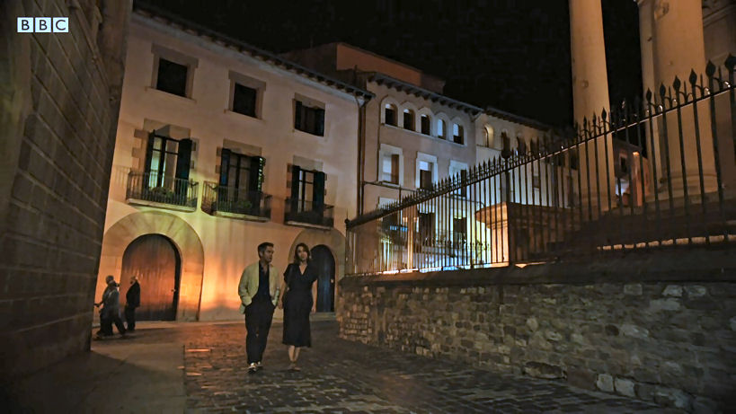 heroines enter the palazzo, go up the stairs in the courtyard, and walk