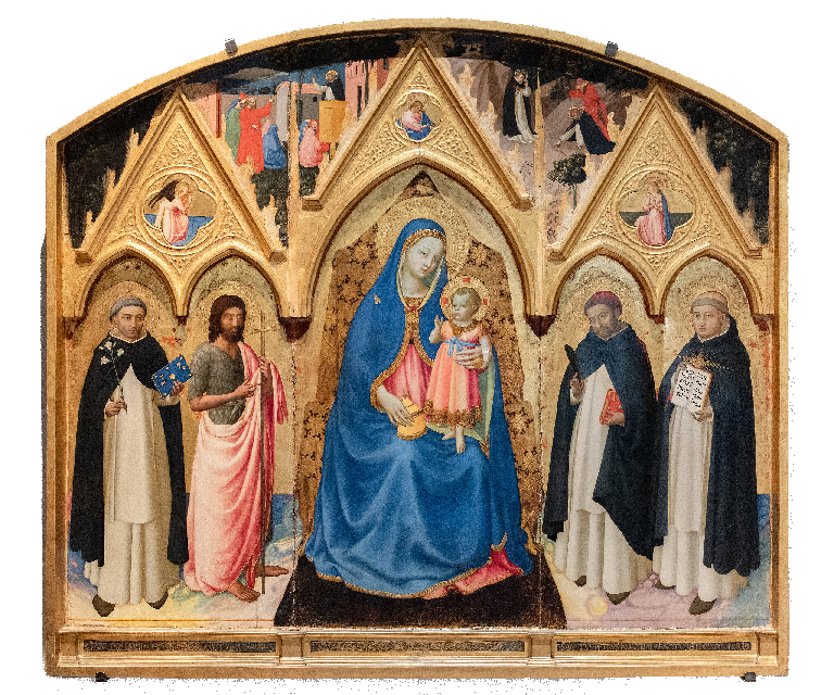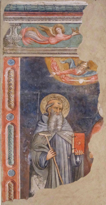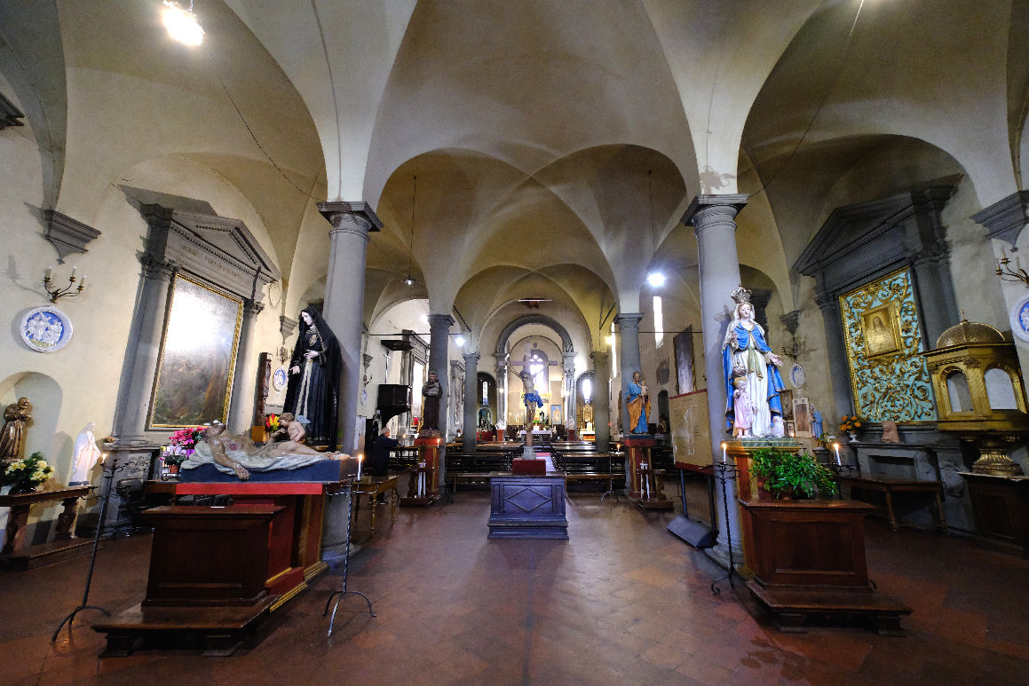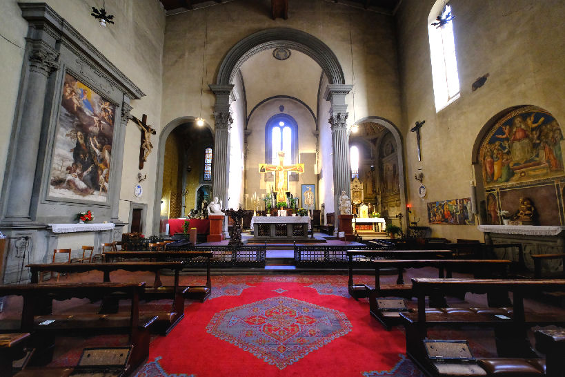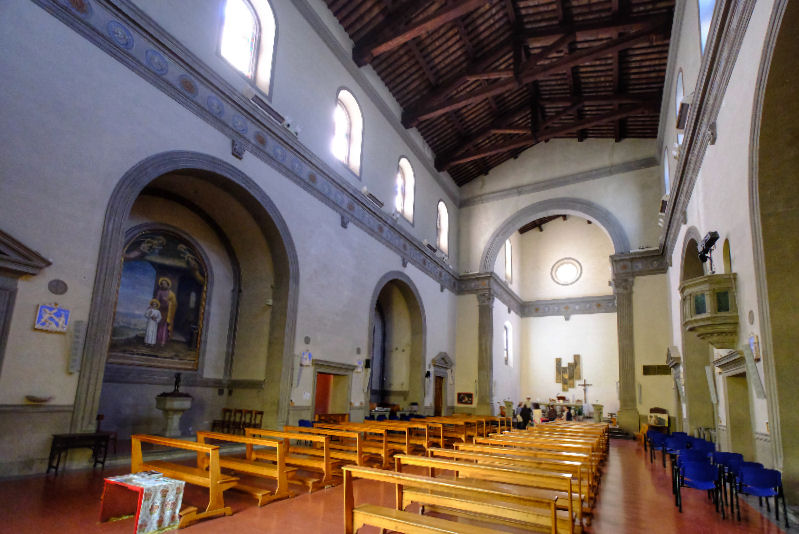 History Originally a Romanesque church founded around 1050, mentioned in a papal bull by Lucius III of March 3rd 1184, the church was largely rebuilt in the late 14th century when it became a parish church to cope with the increased population in the area, funding coming from Bernardo Quaratesi who commissioned from Gentile da Fabriano the Quaratesi Polyptych of 1425, now dismembered and dispersed to various museums (see below). Renovation followed the flood of 1557 and Vasari radically modernised the interior in 1567, installing monumental altars with altarpieces by Il Poppi, Allori and Curradi. Restoration work after the 1966 flood brought to light some fragments of the 15th-century decoration beneath Vasari's additions, such as the Saint Ansanus attributed to Francesco d'Antonio to be found in the chapel at the end of the right-hand side, along with its sinopia opposite. Interior A single nave, tall and plain with a timber roof. Three grey stone and gilded altars down each side of the nave and two flanking the door on the rear facade. Two deep chapels just before the east end, making a crossing of sorts. No labels for any of the art. A fresco showing Saint Ansanus was uncovered here in 1925 and detached (uncovering its sinopia) in 1965. It was initially attributed to Gentile da Fabriano, but later opinion gives it to Francesco di Antonio. It is now in a chapel to the right of the nave. (See photo below right) with its sinopia displayed opposite. It was found behind an altarpiece of God the Father and Saints of Jacopo da Empoli, still on the wall of the nave opposite this chapel. This altarpiece has an ornate oval hole in it through which the face of the saint was visible, it having been mistaken for a face of the Virgin, The left hand chapel has loose tomb slabs propped against its walls. Another detached fresco fragment is on the inner façade, to the left. It depicts Sant'Antonio Abate (see below right) and is now thought to be by the Master of Signa, an anonymous pupil of Bicci di Lorenzo. There is no high altarpiece, but there is an organ loft above. Over the altar in the chapel to the left of the presbytery is a painting of The Preaching of the Baptist (1608) by Jacopo da Empoli, and over the one to the right is The Marriage of the Virgin (1579) by Il Poppi, in a niche meant for a larger painting with an unusually young-looking Joseph. The Michelozzo crucifix is now to be found in a niche over the middle altar on the right side, between two painted cut outs of Mary and John. Jesus has had a cloth tied around his waist, literally. The church has two paintings by Allori, The Martyrdom of Saint Catherine of 1582 over the middle altar on the left, and The Sacrifice of Isaac, signed and dated 1583, on the inner façade on the left. There's also a 12th-century crypt here, the only part of the original church that remains. But photos findable on Wikipedia show it worryingly being used as a restaurant The Sacristy In the sacristy is the reportedly highlight fresco of The Madonna of the Girdle of 1450, probably by Alessio Baldovinetti, in an arched stone shrine attributed to Michelozzo. In here are also said to be found panels by Bicci di Lorenzo and his son Neri di Bicci. I've also read about work here by the Master of Signa, an anonymous pupil of Bicci di Lorenzo, but this may be the fine detached fresco of Sant'Antonio Abate on the inner façade. ![]() Also five panels from a dossal of 1425 by Gentile da Fabriano, called The Intercession Altarpiece (see above) almost certainly commissioned to commemorate the death of Bernardo di Castello Quaratesi. Its central panel depicts Christ and the Virgin’s