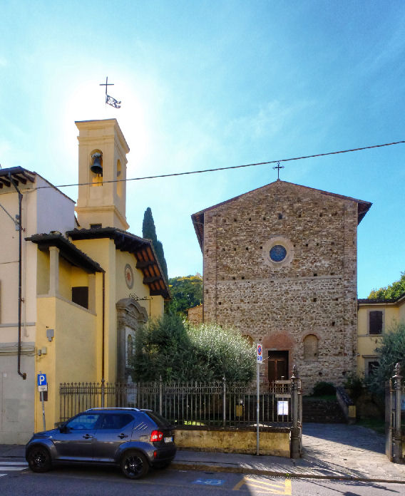 History Built in the 10th/11th centuries in a Romanesque style. According to Vasari Brunelleschi built a chapel here, the Ridolfi Chapel, the dome of which was a dry run for his famous dome on the Duomo. The chapel was destroyed during major rebuilding in the 18th century following responsibility passing to the Missionary Fathers. From 1542 - 1575 the complex was run by Franciscans. Following damage during the 1966 flood restoration work uncovered original features, including columns belonging to the original Romanesque church. The church is currently used by a Greek Orthodox congregation The façade The Romanesque portico, possibly 11th-century, was brought here from the church of San Donato a Scopeto, a church at the foot of Bellosguardo demolished in 1529 to clear ground before the siege. Interior Baroque and dating from 1709. Nice old columns and spandrels