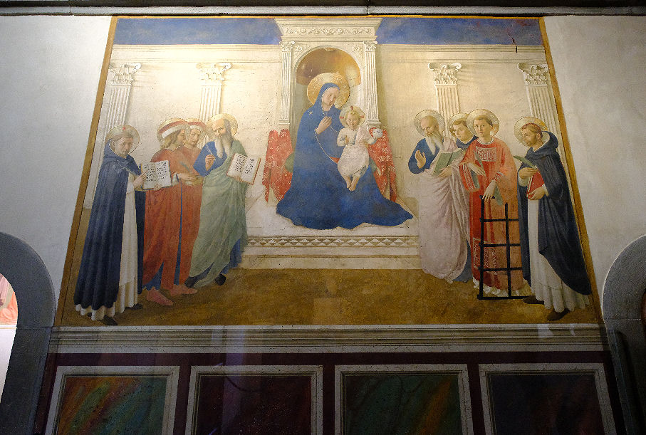 Upon entering you find yourself in Michelozzo's Cloister of Saint Antonino, which has quite vivid frescoes in the lunettes, some by Fra Angelico (the five small ones over the doors in the corners) but mostly they are by an artist called Giovanni Antonio Sogliani, amongst others, painted later and showing scenes from the life of Saint Antoninus, the first prior here. Facing you along the arm of the cloister as you enter is a large fresco of Saint Dominic worships the Crucifix (1442) by Fra Angelico, with added flanking figures of The Mourning Virgin and Saint John by Cecco Bravo in 1628 (see photo right). The marble frame and slab were added later, and the fresco was cropped, when the Fabbroni family were granted this corner. The first room on the right, formerly The Pilgrim's Hospice, now displays panel paintings by Fra Angelico taken from other (mostly closed or demolished) churches and convents. Completely refurbished during the 2020 lockdown, this room is now called the Sala del Beato Angelico. Carrying on anti clockwise around the cloister takes you to a large refectory with unspecial work along the right-hand wall, a quite impressive fresco of The Last Supper of Saint Dominic (with the Crucifixion taking place above) by our friend Sogliani, a former pupil of Lorenzo di Credi, on the end wall, and more by him up the left side. Instead of the Saint Dominic Sogliani had wanted the main scene to be The Feeding of the Five Thousand and provided a drawing, but the brothers wanted something simpler. Vasari admires the work but says that Sogliani should have been allowed to paint his choice 'because painters express the conceptions of their own minds better than those of others'. Opposite is a small room more worthy of attention with some sweet Fra Bartolomeo panels and his famous dark post-mortem profile Portrait of Savonarola. Fra Bartolomeo was a fellow Dominican and a great admirer of Savonarola, even being imprisoned with him in 1498. The refectory here was enlarged in the 16th century with the loss of a Crucifixion fresco on the former end wall by Fra Angelico. For the new end wall of the extended refectory Antonio Sogliani painted a fresco of The Miraculous Supper of Saint Dominic in 1536. The subject is a more Dominican version of The Miracle of the Loaves and Fishes. Next around the cloister is a The Chapter House, a square room with a big and lovely Crucifixion fresco by Fra Angelico (1441-2), but looking much more worked than his usual (see right). It's the largest work that he made here. On Christ's right hand are the group around the Virgin (Mary of Cleophas, Mary Magdalene and John the Baptist) and the patron saints of Florence and the Medici, painted in bright colours. To his left are the founders of five religious orders, led by Saint Dominic, painted in duller earth colours. The Dormitory and Library Next is upstairs. The works up here would practically only have been seen by the friars, until the general public were allowed in in 1869 when the museum was opened. On the first floor are the 44 small cells containing 40 frescoes, painted 1441-43, for private contemplation by Fra Angelico and his studio, including Benozzo Gozzoli. In addition Battista di Biagio Sanguigni and Zanobi Strozzi, long-standing acquaintances and assistants are the names most often mentioned. All were painted in true fresco, and swiftly, it seems. It was unusual to have such large images in dormitory rooms. The large Annunciation at the top of the stairs is justly one of Fra Angelico's most well-known and loved works. It is somewhat austere in colour and traditional in execution, as is fitting for the brothers. The scenes in the cells are even more austere (see below right) to the point of sometimes almost seeming unfinished. Turning left here takes you down the east corridor, the clerics' dormitory, with the paintings in the cells here largely by Fra Angelico himself. For the clerics their are scenes from the life of Christ or the Virgin, witnessed by one of the major Dominicans - Dominic, Peter Martyr or Thomas Aquinas - like the Annunciation (right) in cell 3, with Peter Martyr praying behind the Angel. The scenes in the 20 cells of the clerics are more theologically complex than those in the novices' and lay brothers' cells. In this corridor is the renowned Virgin of the Shadows (see below) so named for the distinct shadows cast by the column capitals, painted as if thrown by light from the only window in the corridor. It is ranked as a mature high point in his career. ![]() This corridor leads to the south corridor, the novices' dormitory, (cells 15-21) where the images are of Saint Dominic Adoring the Crucifixion and are more instructive, as befits the cells of young boys in training. This was the last corridor completed, and said to be mostly the work of Angelico's assistants. At the end of this corridor is Prior Savonarola's rooms. Retracing your steps and turning right back at the Annunciation, takes you into the north corridor, the dormitory of the lay brothers', or conversi, (cells 31-44) mostly the work of Benozzo, where the first cell on your left is that of Saint Antoninus. The lay brother' cells all have straightforward narrative scenes from the New Testament, as appropriate for less educated brothers who attended to the community's domestic needs. Aside from the famous Annunciation the north corridor also contains a large Saint Dominic Adoring the Crucifix. On the right you reach the entrance to Michelozzo's famous library. Long lauded as a fine typical Brunelleschi-inspired renaissance interior with its white walls and pietra serena details, the walls were recently discovered, under plaster applied since suppression, to have been green, a colour said to be symbolic of contemplation often used at the time for the walls of libraries. The vaulted aisles and barrel-vaulted ceiling makes this one of the few parts of the complex that doesn't have a wooden ceiling, denoting its importance, a