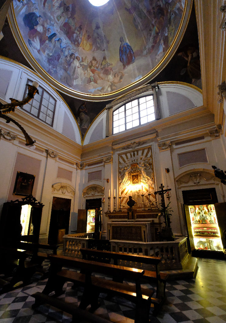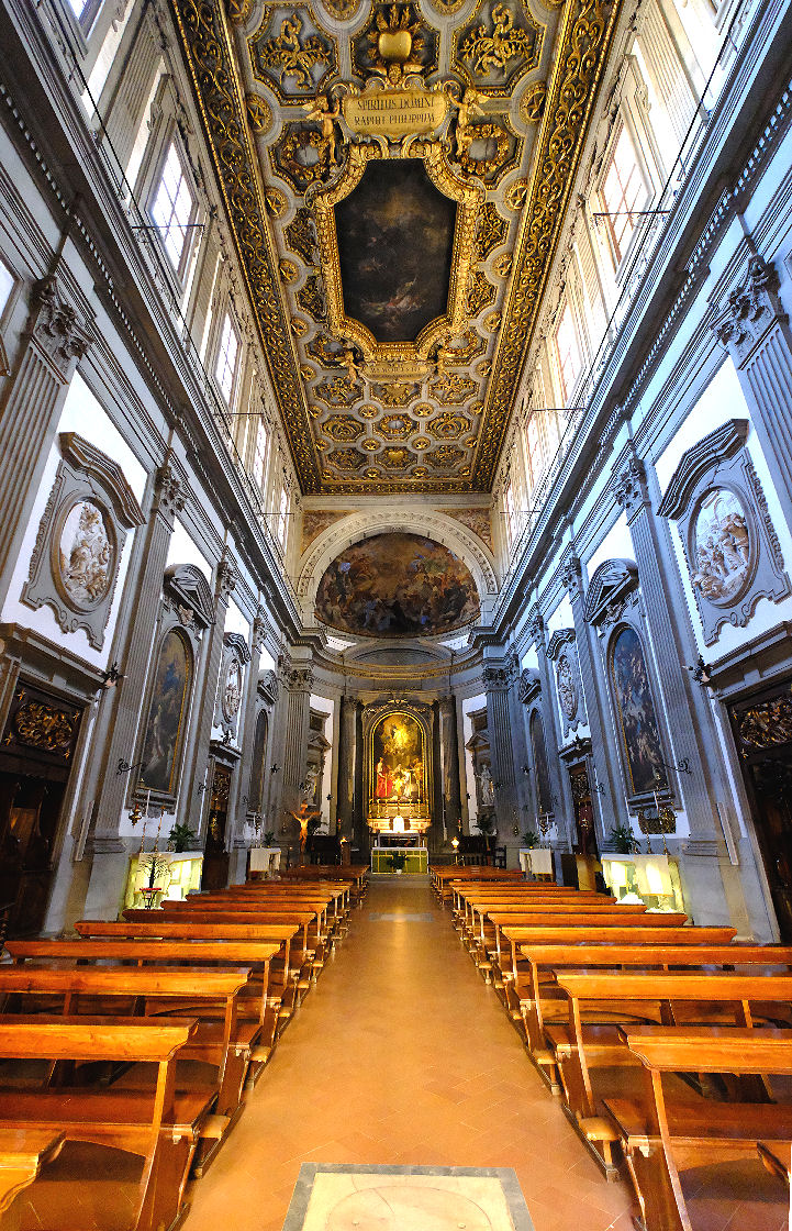 History San Florenzio was a 12th-century Romanesque brick church when the Oratorians acquired it in the 1640s. A new church was commissioned to plans from Pier Francesco Silvani, after initial plans, commissioned from Pietro da Cortona, were found to be too extravagant. The church's façade, said to have been inspired by San Gaetano, was finished by Ferdinando Ruggieri in 1715. The separate oratory was demolished and rebuilt to designs by Zenobi del Rosso from 1772-5 who then designed and built the unifying facade with the matching oratory entrance at the right end. The seminary between the oratory and the church was suppressed in 1769 and again in 1808, but was returned to the Oratorians in 1814. When Florence was the capital of Italy, around 1866, the complex (except the church) was used as government offices. Later it was put to use as civil law courts, amongst other things, and since July 2017 it has housed the Franco Zeffirelli International Centre for Performing Arts. On the 24th of January 2021 the Andrea Bocelli Foundation ceremoniously opened its new HQ and education hub here too. Interior ![]() The space is big, tall and baroque but with no aisles, just three huge altars down each side, each with big altarpieces by 18th century painters you won't have heard of. It's all dark pietra serena with a flat and very gilded coffered ceiling, with a central ceiling painting by Giovanni Camillo Sagrestini depicting the Glory of St Phillip, under an airy clerestory with four plain windows down each side. There's a stone organ gallery above the door. The semi-circular apse has a painted half-dome frescoed with The Trinity, Apostles and Florentine Saints by Niccolò Lapi. There are two confessionals between the altars on the left, and two more at the back. There's only one on the right as where another should be (between the second and third altars) is the entrance to a chapel. This space (see right) is wider than it is deep, with a carved altarpiece, some more dark art, and two more confessionals. Filippo Neri was famously a keen hearer of confessions. In this chapel you'll also find a chair, a small table and the death mask of Filippo Neri in an ornate glass case with his bust on top. The Oratory is pale and less extravagantly decorated, although still solidly baroque in style. It has more of the appearance of an auditorium as St Philip Neri saw singing praise as a primary occupation of the Oratorians, hence the name.