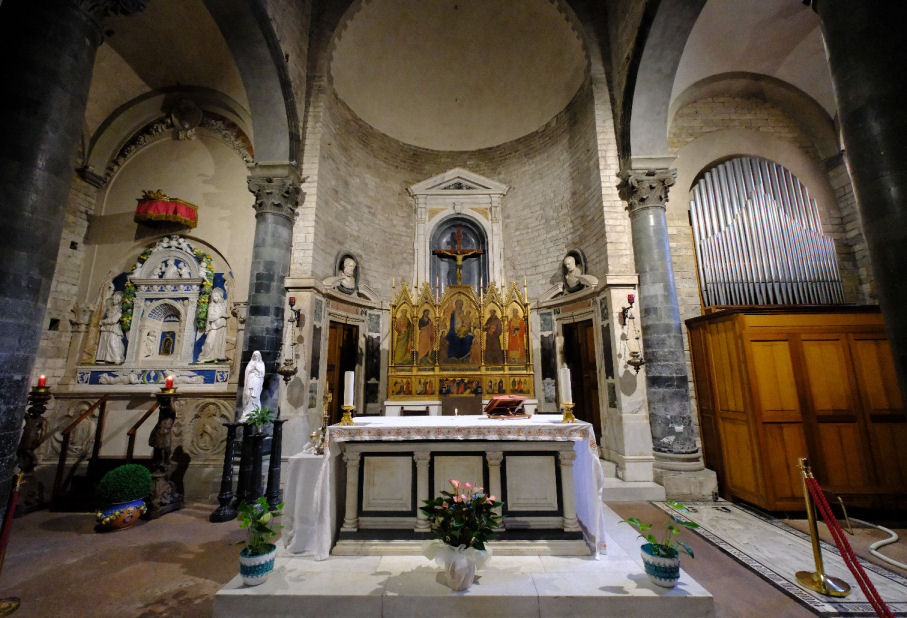 History ![]() Legend, and a stone slab on the façade, has it that this church was founded in April 805 by Charlemagne, but its first documented mention is dated the 27th of April 1075. Most sources go with its being built in the 11th century, maybe even a century earlier so this is still probably the oldest church on this side of the Arno, with the exception of the Baptistery. The church was remodelled in the 15th and 16th centuries, the work largely funded by the Altoviti family. Another legend claims that Michelangelo convinced Bindo Altoviti, who planned more drastic rebuilding, to preserve the existing fabric. Bindo it was who offered Michelangelo refuge when he fled from Florence to Rome and whose famous portrait by Raphael, as a handsome youth, is in Washington. Since 2014 the church and parish have been entrusted to the Legionaries of Christ (Regnum Christi), an organisation which has been long plagued by sexual abuse scandals, especially those involving the order's founder Father Marcial Maciel, who was accused of sexually abusing many minors and fathering six children by three women. In December 2019, the Legion accepted responsibility for 175 cases of child sexual abuse by 33 priests, including 60 minors abused by Maciel, but a year later horror stories and accusations of cover-ups from the Pope on down continued to circulate. Controversy also surrounds the Legion's recruiting practices, elitist theology, and the it's multi-million dollar offshore holdings in tax havens. Façade The white and grey marble doorway from 152, in the unfinished 11th-century Romanesque façade, features the coat of arms of the Altoviti family - a rampant wolf - and is attributed to Benedetto da Rovezzano, who was also responsible for the font inside and one of the many Altoviti tombs. Interior The interior is said to have inspired Brunelleschi (who is said to have thought the building was truly ancient, rather than relatively-recent Romanesque) and used as a model for San Lorenzo and Santo Spirito. Rough brick at the apse end and above the seven Romanesque arches that divide the nave from the aisles. Very small clerestory windows make this a dark church. The decorated wooden ceiling was added in 1333. A row of sizable columns, made from green Prato marble, down each side separating the nave from the aisles. The ancient roman capitals at the top of the first pair of columns probably came from a baths nearby, the rest are copies. The right side has five shallow chapels, all baroquely decorated with four deeper and less decorated (and earlier?) chapels along the left side. They vary in decoration, but have mostly middling 16th century art. The first bay on the left has a very damaged fresco - only the heads of the Virgin and Child and two angels remain - and its more complete sinopia. To the left of the apse is a polychrome Eucharistic tabernacle of c.1512 by Andrea and Giovanni della Robbia. To the left of this is the wall tomb of Oddo Altoviti (who paid for most of the reconstruction work here) by Benedetto da Rovezzano, which seems to have originally housed the Eucharistic tabernacle. Opposite over a doorway is the tomb of Bindo Altoviti (1570) from the studio of Bartolomeo Ammannati. There is also the monument of Antonio Altoviti with busts of Charlemagne and Antonio Altoviti by Giovanni Caccini. The Romanesque semi-circular apse contains a not-well-lit altarpiece, a Gothic polyptych of 1382 of The Virgin Enthroned with Saints and Angels (see below) probably by Jacopo di Cione with help from his frequent collaborator Niccolò di Pietro Gerini. It came here from the convent of the Poor Clares in via dei Malcontenti (Montedomini maybe?) in 1950 to replace the Pentecost by Orcagna mentioned in Lost art below. The Virgin and Child are flanked by two angels and Saints Clare and Catherine of Alexandria. The four flanking panels contain Saints Lawrence, John the Baptist, Francis and Stephen. The predella has an Adoration of the Magi in the centre with more saints processing in panels either side. The white and green marble altar dates to 1901. Another altarpiece by Jacopo, La Madonna della Neve, was finally returned to this church in June 2024, it having been in storage following damage during the flood of 1966. It is in the fourth chapel on the right, and looks very the worse for its experiences.