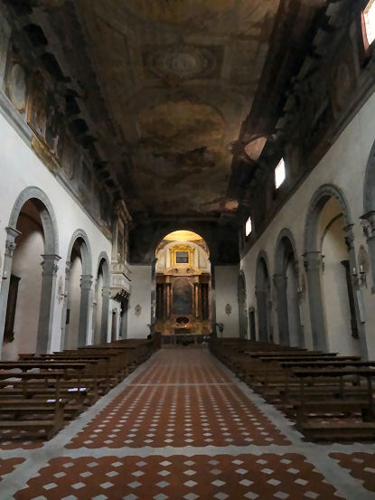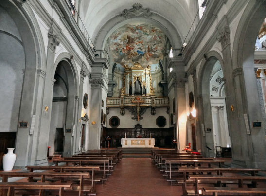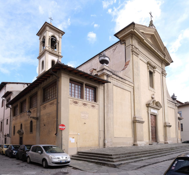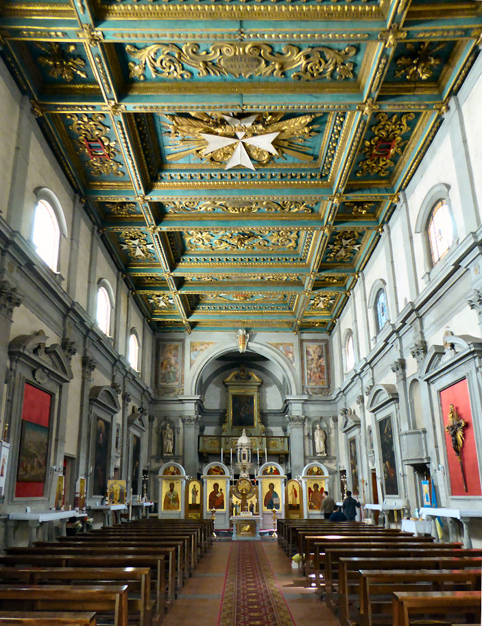 ![]() ![]() History There was a small oratory here by around 1191, built in vineyards owned by the monks of the Badia Fiorentina. A church replaced the oratory in 1209 and was enlarged in 1243. Consecration followed in 1247 when the building was designated a parish church. It was badly damaged when the Arno flooded in 1557. The archbishop of Florence, Alessandro Marzi Medici, elevated its status to that of a priory and named Giovanni Niccolai as its first prior in 1608, a post he held until his death in 1642. Niccolai fortunately came from a wealthy family and so initiated renovation work on the church. By 1619 a new high altar of Carrara marble was added and the choir stalls and presbytery were completely renovated under the patronage of Niccolai and Bartolomeo Galilei, a relative of Galileo, a Knight of Malta, and steward to Leopoldo de' Medici. This work, by the architect Gherardo Silvani, did not include the facade but did result in the destruction of tombs, chapels and 14th century frescoes. The final stage of Silvani's renovation (the gilt green ceiling) was completed in 1665. The floor of terracotta tiles and pietra serena is patterned to reflect the design of the ceiling and was restored after the 1966 flood. The church is currently used by the Ukrainian Greek Catholic Church, whose iconostasis is visible in the photo (see right).
