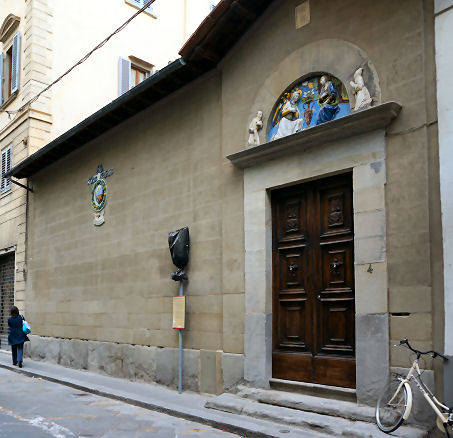 ![]() The oratory passed to the confraternity of San Pietro Maggiore, founded in 500, in the 16th century. In 1783 it became a parish church, taking the name of the demolished church San Pier Maggiore, but was deconsecrated in the next century. It is now home to the Dante Alighieri Society, which promotes Italian culture and runs language courses. Above the front door, which is the entrance to the cloister, is a glazed terracotta lunette of The Annunciation between two hooded brothers by Santi Buglioni, who was a young relative of the wife of Benedetto Buglioni, who headed up a rival studio to the della Robbia and probably trained with them. Santi took the Buglioni surname and inherited Benedetto's workshop. Interior Inside are a series of rooms and a cloister, decorated between 1585 and 1590 by Bernardino Poccetti, Giovanni Balducci, Bernardino Monaldi, Andrea Boscoli , Bartholomew Traballesi and Giovan Battista Naldini. The subjects include Martyrdoms of the Apostles (in the cloister), The Passion of Christ and The Life of the Virgin. Recent renovation has benefited the previously crumbling façade and brightened up its terracotta decoration. |