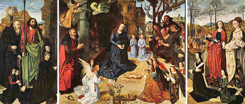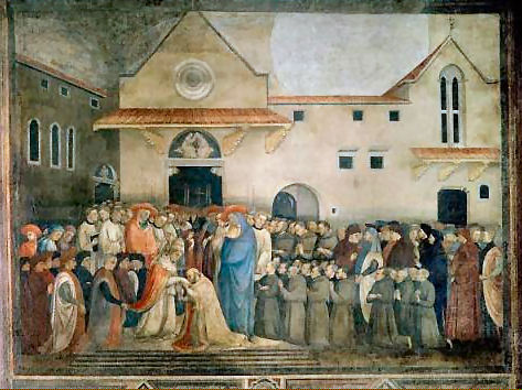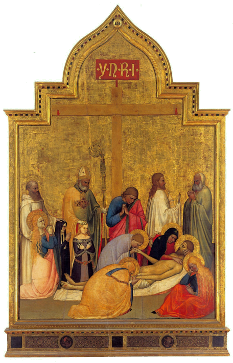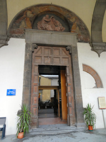 ![]() The origins of the church and convent of Sant'Egidio (Saint Giles) are unknown, but are thought to have been Romanesque. The original complex, centred on the church of Sant'Egidio, had been run by the Frati Saccati, (Friars of the Sack) a mendicant order, suppressed by the Council of Lyons in 1274, whose Provençal saint the church was named for. Papal suppression didn't prevent the remaining friars living out their lives in the order, which remained here until at least 1286. The land and buildings thereby became available and were acquired to become the Hospital of Santa Maria Nuova, which was founded in 1288 by Folco Portinari, the father of Dante's Beatrice. The hospital expanded during the 14th century, but the first rebuilding of the church came following the old church's destruction in 1418, when it was enlarged, to designs by Bicci di Lorenzo, and new painted decoration added. This work was implemented by the then spedalingo (hospital prefect) Michele di Fruosino da Panzano, who also commissioned the fresco (see far below left) of Pope Martin reconsecrating the church in 1420, which shows the spedalingo kneeling before the pope and kissing his ring. The present appearance of the church is the result of a 16th century restructuring, attributed to a plan by Bernardo Buontalenti (1528-1608) and carried out by Giulio Parigi in 1611. The terracotta lunette of The Coronation of the Virgin over the entrance (see above) is a copy of the original by Dello Delli from c.1420/24 which is in the hospital museum. Interior Aisleless and boxy with a pair of tall pietra serena altars either side, the second on the left featuring a Deposition by Allori most dark and dingy and in need of cleaning. There's a double-tier nun's gallery at the back, which I'd not seen before, with some heavy-duty grill work, and there are more grills on the left-hand side. Much middling 17th century art. The 15th-century frescos that decorated the walls were covered by four classical altars in pietra serena (two on either side) during the 16th-century rebuilding by Buontalenti, who is also partly credited with the steps in front of the high altar. The baroque balustrade, which blends stylistically with the altar in patterns of semi-precious stones is later. Facing the steps are the tombstones of the Portinari family. The ceiling decoration is the result of the collaboration between Giuseppe Tonelli who took care of the painted architecture and Matteo Bonechi who added the figures in the first half of the 18th century. The earliest surviving Eucharistic tabernacle in Florence is said to be the 1450 marble panel set into the wall here by Bernardo Rosselino, with a gilt bronze door by Ghiberti. Lost art An almost square Annunciation panel by the Master of the Straus Madonna (c.1395-1405) from the hospital is in the Accademia. Fra Angelico's Coronation of the Virgin, now known as the Paradiso, painted around 1435 (see right) originally sited over an altar on the rood screen here and mentioned by Vasari in his description of Sant'Egidio, has been in the Uffizi since 1948. Two long predella panels, showing The Marriage of the Virgin and The Dormition are in San Marco. Also on the rood screen would have been an altarpiece painted between 1434, when it was commissioned by Michele di Fruosino, rector of the hospital, and 1439, when it was delivered, by Zanobi Strozzi. It was placed on an altar dedicated to St Agnes and has been identified as the Virgin and Child with Four Angels, now in the Museo di San Marco. A great six-panel cycle of frescoes (1439-1470) of The Life of the Virgin, commissioned by the Portinari family and highly praised by Vasari, which decorated the choir of the church was begun between 1439 and 1445 by Domenico Veneziano, with Piero della Francesca and Bicci di Lorenzo as his assistants. They painted three scenes, with Andrea de Castagno adding three more opposite between 1451 and 1453. The final unfinished panel was completed, around 1461, by Alessio Baldovinetti. All of it is now lost, with only some unrevealing decorative panels remaining, as well as a sinopia (underdrawing) by Domenico Veneziano of a nude woman with perspective lines, these fragments being now installed in the refectory of Sant'Apollonia. It is said that the cycle's depiction of hospital patrons was also a celebration of Cosimo de'Medici's flight from Florence in 1433, as many of the Medici partisans who engineered his escape from prison were depicted. It is during their painting these frescoes that Andrea de Castagno (according to Vasari) murdered Domenico Veneziano. He writes that Blinded with envy of the praises he had heard of Domenico’s talent, Andrea determined to be rid of him. He considered various ways of killing him, and one of them he put into action as follows. One summer evening, as was his custom, Maestro Domenico took his lute and made his way out of Santa Maria Nuova, leaving Andrea there drawing in his room. Andrea had declined his invitation to join him on a walk, saying he had some urgent drawing work to do. So Domenico went off and pursued his usual rounds of pleasure in the city. But on his way back, unknown to him, Andrea was waiting round a street corner, and with some lead weights he smashed both Domenico’s lute and his stomach with one blow, and also struck him violently on the head with them. Then he ran off, leaving Domenico half dead on the ground, and returned to his room in Santa Maria Nuova, and leaving the door ajar he sat back down at the drawing he had left. Stirring stuff, but unfortunately it has been proven that Veneziano lived for four years after the death of Andrea. The Adoration of the Magi, a hugely influential altarpiece by Hugo van der Goes (see photo right) has been in the Uffizi Gallery since 1900. (Along with some other pictures that had for a while been in the house in via Bufalini where Ghiberti had his workshop.) It was commissioned by Tomasso Portinari, a Medici agent working i