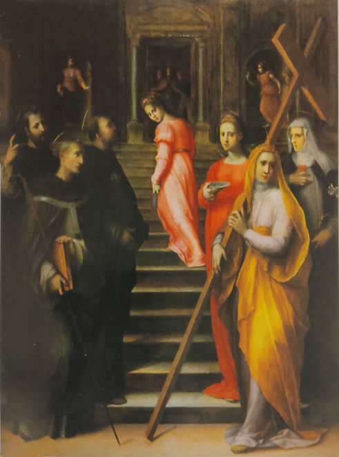 History The convent of La Crocetta, more formally known as the Monastero di Santa Croce, got its nickname from the small red cross the nun's wore on their robes, was founded by Suor Domenica da Paradiso, in 1511. Formally approved by Pope Leo X in May 1515, building work was finished by 1519, with the financial help of Cosimo de 'Medici. Expanded and renovated by Giulio Parigi in 1612, work which included the building of the corridors over the road which still remain (see right). From the late 16th century into the first half of the 17th the convent was a notable centre of musical performance. Suppressed in 1808 the complex has been put to various legal, medical educational uses in the years since, briefly returning to religious use in 1816, it was used in the years that Florence was the capital of Italy (1865-1871) as the Court of Auditors, the nuns having been moved, with the relics of their founder, to the via Aretina, to the east of Florence, where they remain. The former convent and church are now, following renovation work in 2008/9, used by the University of Florence's Faculty of Political Sciences and Law. The Hotel Morandi alla Crocetta incorporates the nun's chapel. Domenica da Paradiso Domenica Narducci, called Domenica da Paradiso, was a nun who acquired her name having been the daughter of a gardener who worked in the convent in Paradiso, a suburb of Florence. She took orders at the Augustinian convent of Santa Maria dei Candeli, where she was unimpressed by the spirit-sapping drudgery of the nun's life, especially for a nun with a peasant background. She fell ill and was allowed to leave the convent. There followed a short stay at the convent of Santa Brigida at Paradiso which was even more constricting and so she moved to Florence with some like-minded women, where the group so gathered around her fell under the Savonarolan influence of the friars of San Marco. But the protracted furore surrounding Dorotea da Lanciuole, another founder of a female religious house with a similar background to Domenica, who was found to have been faking her claim to have been miraculously surviving without earthly sustenance, led to her splitting from the Savonarolan Dominicans, claiming she had had a visitation from St Dominic himself. After having established her convent, with support from the Medici, who were happy to support an anti-Savonarola faction, she retained her influence, and reputation for controversy, through the Medici's expulsion and restoration and was later beatified. Miraculous images Before the founding of the nunnery Suor Domenica, on her way to SS Annunziata to pray before the celebrated miraculous Annunciation, heard a voice say 'Dominica, free me from this disgrace'. The voice turned out to be coming from a Nativity displayed in a nearby painter's shop, amongst images of lascivious subjects. This image was later placed above the altar in the nun's inner church. It was thought to be what saved the convent from a fire in July 1515, said to have been started by the devil. When the fire broke out Suor Domenica preyed before the the Nativity for help, and the Virgin told her to make the sign of the cross, which did the trick. Following the fire the image was moved to the high altar of the convent's public church, and a painting depicting the miracle was installed. |