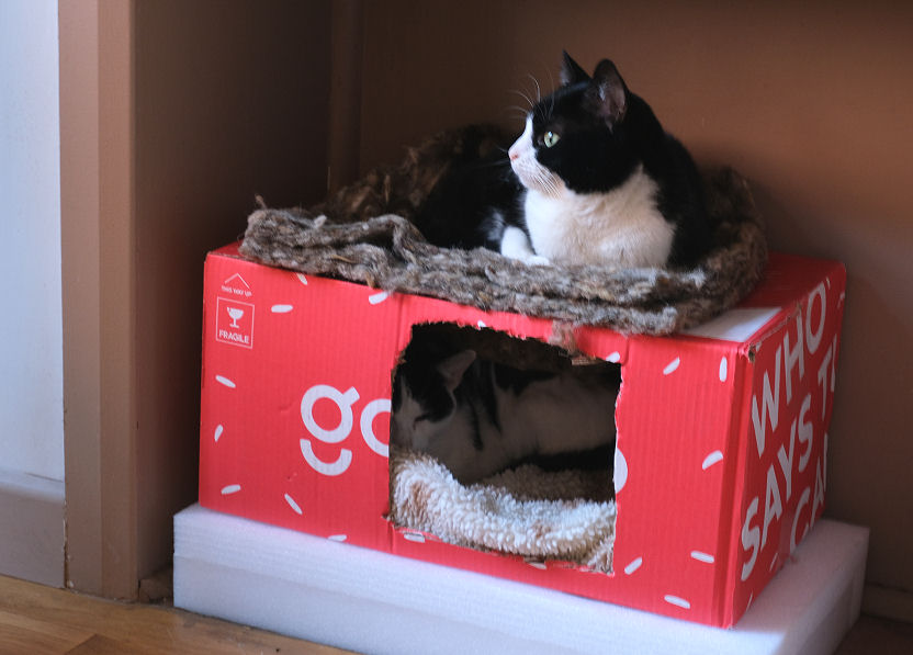 Monday 11th January Usually we would have left longer after the passing of Oscar, our previous cat, before contemplating acquiring new cats, but what with the strains of Covid Lockdown 3 one of us was feeling the need early and started monitoring the Cats Protection website before Christmas. We'd learnt that there were less cats needing homing currently because of the virus and people being more homebound and less mobile. But eventually Lily and Minnie appeared, looking sweet and needing homing as a pair. After two long homing phone calls, the second one involving payment and the ordering of equipment and supplies, delivery was arranged for this morning. Usually there'd be more visits and we'd need to go collect the cats, but what with the coronavirus, social distancing and all, the cats would be left on our doorstep like Amazon parcels, while the driver from the CPL kept his distance. Which was all fine by us as we don't have a car. We were told to expect a phone call in the morning telling us when to expect delivery, but the first we knew was the doorbell ringing around 10.00 and soon we had two new cats in the house. Minnie is 5 years old and Lily is 4, they are what CP call a bonded pair, but are they sisters? We were told that their previous owner had had to give them up because they could no longer cope with them. Oddly Lily had not been spayed or microchipped, so CP had had these things done over the Christmas hols. We'd ordered two new cat carriers from CP as only one of our old ones was complete, and having them delivered in new carriers meant we didn't have to turf two probably-scaredy cats out of the CPL's ones to give them back. As it transpired Minnie was meowing to be let out as soon as I put the carrier down and when I opened the grill she was out and exploring all corners and surfaces. To acclimatise new cats it's advised to keep them in one room for a few days and then let them roam when they're settled, usually after a few days. We chose the back room and kitchen extension as it has hard flooring and access to the kitchen where they'll be fed and to the toilet in the shower room. They would be using a litter tray, at least initially, you see - we were told that they were cats who weren't used to a garden. Anyway Minnie was, as I say, immediately exploring, using the litter tray, nibbling a few biscuits, and finding the door to the rest of the house a source of real fascination. Lily stayed in her carrier, towards the back, peering through the slots, and later burrowed herself under the towel in there. We'd ordered some biscuits and a scratching pad and litter tray from CPL, but they also give us a bumper supply of the toys, towels and mats, and even a cat bed, which the pair had used and so would find reassuring. It's all about scent and cats not really settling in until a place smells of them. ![]() In the afternoon we left them be in the closed room - Minnie to settle down a bit without our exciting presence and maybe Lily would emerge. Later I went and sat on the sofa and Minnie, who had settled in a box we'd provided came and rubbed around and stood to be stroked, rather than just allowing it in passing, and then lay down next to me to have a wash. Only much later in the evening did we come back from watching some telly after eating to find that Lily had come out of her carrier, but only to hide behind the sofa. Still: progress!