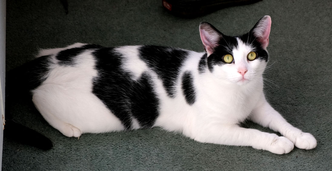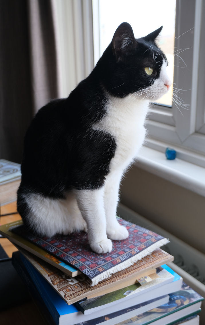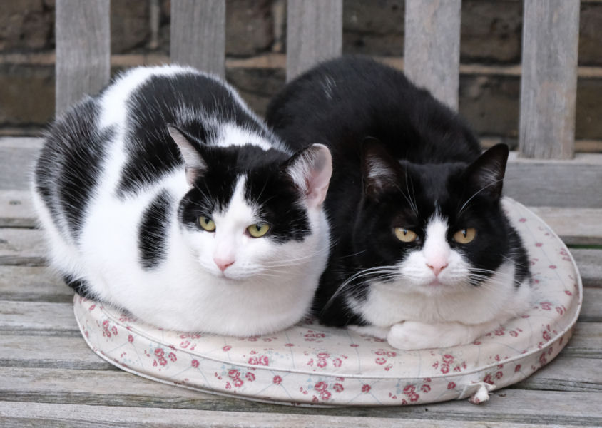 On the occasion of the second anniversary of the socially-distancing chap from Cat's Protection leaving Minnie & Lily on our doorstep the pair of them kindly posed for celebration portraits. They've settled in fine. Lily hides behind furniture hardly at all, and they both desire our company more, but not all the time, of course. Lily likes to chase lights, even more than before, and Minnie's habit of bringing us twigs persists. But nothing alive has been brought in since the multiple-mice event mentioned above.