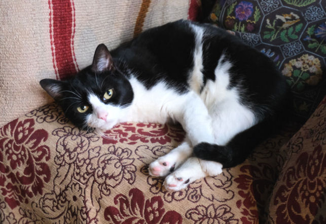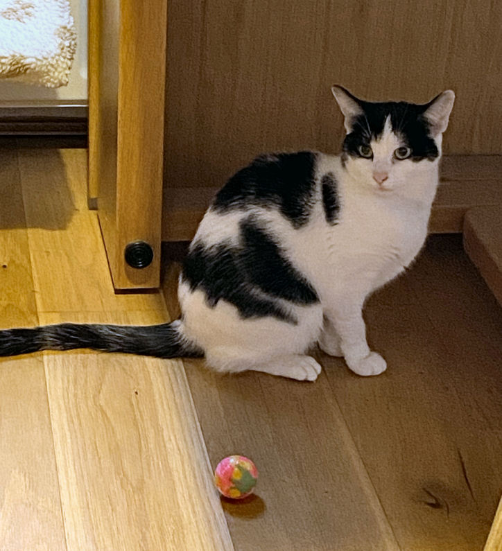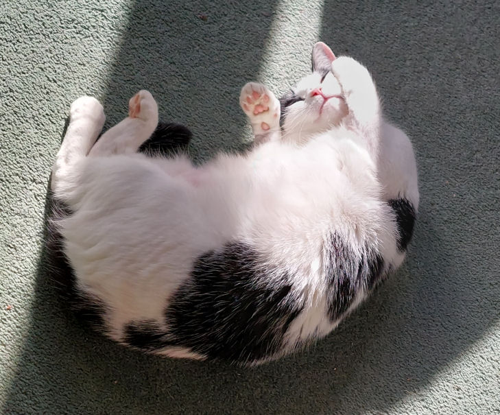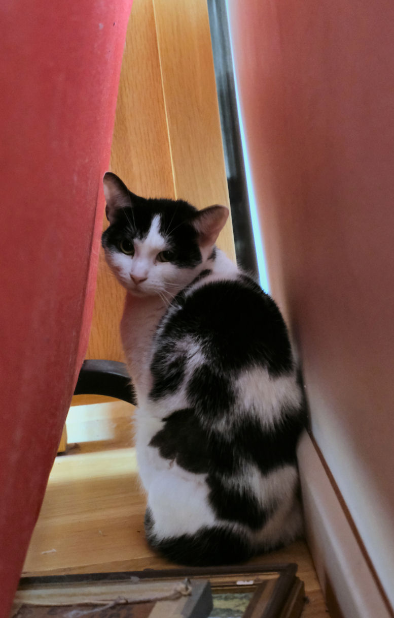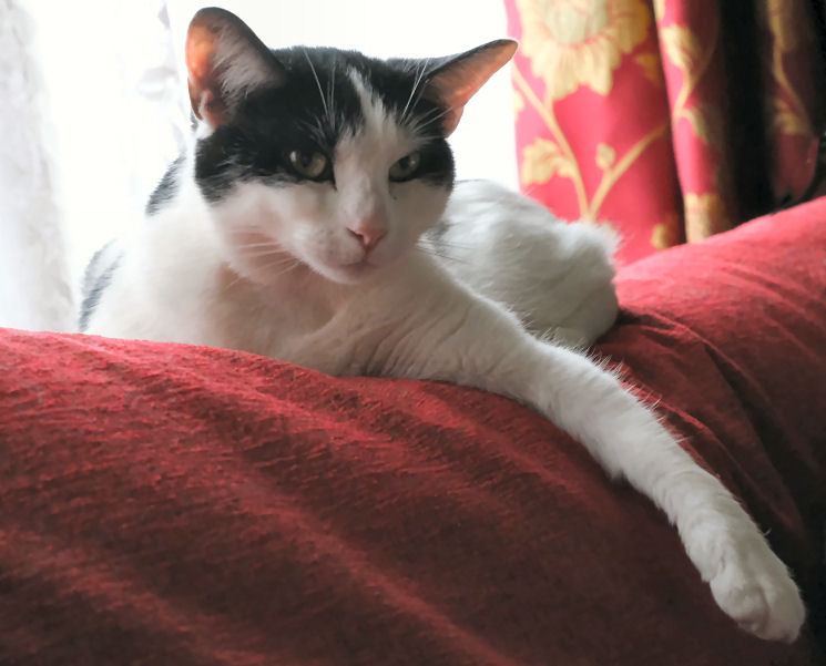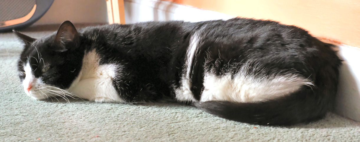 August to Christmas In August Lily started sitting and snoozing on Jane's lap, and continues to do so daily, especially when Jane is wearing a towelling bathrobe. The best I've managed is her (Lily) snoozing against my thigh. Once. It's arguable that a bit of pairing has developed, as Minnie often comes to find me when I'm at the PC, for rubs and the traditional stomping on the keyboard. They still eat little but their biscuits, although Lily likes a bit of chip-shop fish, and is now usually to be found waiting on the dining table by the time we've unpacked our Deliveroo from the chip shop. She has also become what one might politely call a chunky cat (see photo right). When they are together stroking Minnie's head invariably starts Lily purring, which is sweet. Strangers in the house still make Lily run and hide, but although deliveries and Deliveroo drivers tense her up she now rarely makes it behind the sofa before they've gone, and if she does she's out and about pretty soon. For Minnie strangers in the house are mostly a cue for investigatory sniffing. Lily still likes chasing the laser pointer, and reflections generally and Minnie still likes to bring gifts and has a special tone of meow to signal this. These gifts are now mostly from the garden, usually bits of wood, or twigs, or the like. Squirrels and sparrows and pigeons are the sources of fascination and stalking and dashing, but no creatures, thankfully, had been presented until the first dead mouse on 30th December. But then on the 31st I had to deal with five baby mice in succession, all alive, and taken back into the garden, so the five might have included some repeat appearances. |