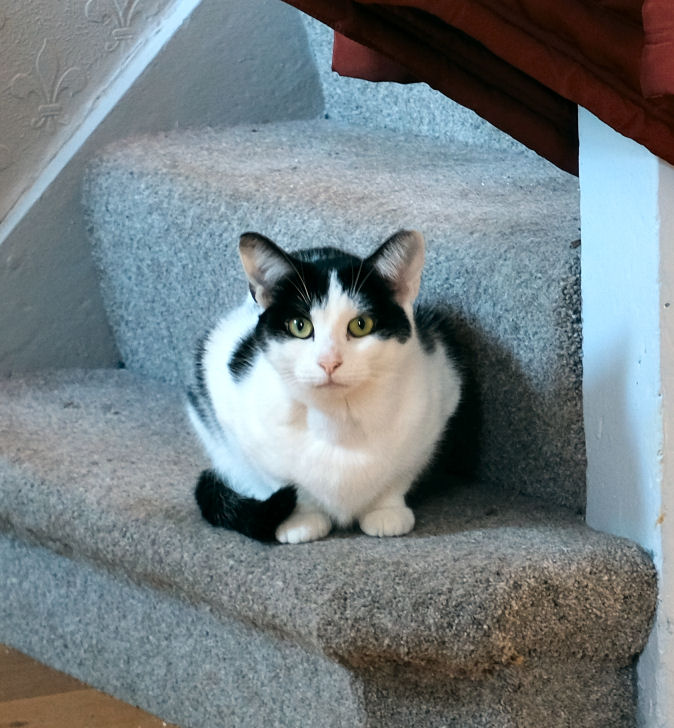 Thursday 5th ...which continued, and she even now purrs and does cute head-rubbing-and-rolling greeting things in the morning. She's still going to run away if we're too near, especially if we're standing up, but she's coming along, and definitely spends much less time hiding. Sunday 7th And then today, after a somewhat fraught morning spent on the phone getting an emergency plumber to help us get our boiler working, Lily was actually sat on the back of the front room sofa, as we came in and sat down on it after lunch, with teas and a hot cross bun, and stayed there, even while I took photos, and later just curled up and snoozed there! For the whole afternoon! Minnie has taken to the stairs for relaxing and keeping watch, as you can see.