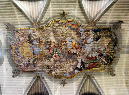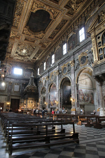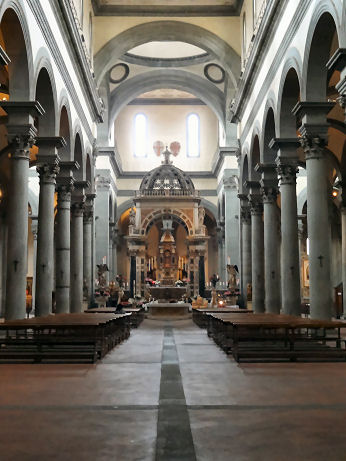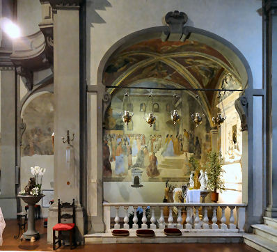 It rained on us as we made our way to San Marco, but that turned out to be the only real rain that fell on us, although dark-cloudiness persisted. Stopped off at San Giovanni degli Solopi on the way, which turned out to be a bit crapi. Maybe I'm being unduly harsh in my pursuit of blindingly clever word play, but this was unarguably a gloomy church on a rainy day. The ceiling has a somewhat congested painting, and weird stripy discolouration too (see above right). The San Marco complex was oddly free of entry charges, and full of parties of teenage kids. The lower floor of the Sant'Antonio cloister as you go in is confusion of rooms full of second-rate stuff, with nothing much to bring you up short. (Whilst typing this up I consulted the guide book I bought, and discovered we'd missed a room called the Pilgrims' Hospice (first room on the right) where all the good (Fra Angelico altarpieces) stuff was.) The upper floor, with the monk's cells frescoed by Fra Angelico is a must-see, though, in Florence and for all renaissance art junkies. Every cell is different, although gory and spurty crucifixions seem to dominate. The cell that Cosimo de'Medici used to use, with its Adoration of the Magi, is a highlight; as is the one with the sweet little Annunciation (see right). Don't miss the Ghirlandaio Last Supper in the refectory/gift shop either - it's very similar to the one in Ognissanti, but very fine, if you can block out the sitters and shoppers. The church itself is a bit disappointing - an aisleless box by Michelozzo with a very gilt-scrolly ceiling - but it has some nice bits of uncovered fresco fragments and the chapel of Sant'Antonio at the end on the left has some good mannerist stuff, including an altarpiece of The Descent into Limbo by Allori. On to Santissima Annunziata, with its frescos as soon as you get into the entrance cloister, by the likes of Pontormo and Andrea del Sarto, made somewhat less of an attractive space by a posse of, pardon me, pushy gypsy beggar women. Inside it's an impressively confusing dark and dusty space, with added baroque-period gilding much in evidence again (see right). It's Michelozzo's work again, with connected chapels up each side and an OTT main altar with chapels in a semi-circular choir behind. There's an unsignposted door to this choir in the left transept, and I recommend it as there are good views from behind the altar and some superior (if unlabelled) altarpieces, by Bronzino and Giambolgna amongst others. A service started soon after we arrived, but we weren't ushered out. But it was taking place in the spectacular tabernacle (on the left as you enter), so I didn't get a good look at this, or the chapel nearby with Castagno's odd Trinity fresco. And by the time I got into the Choistro dei Morti a monk was gently booting everyone out, so I didn't get to see the chapel of the artists' confraternity where various late-16th Century painters are buried. If you're interested in this period's mannerist artists, as I'm beginning to be, then this church is an essential visit. Gnocchi with a fresh tomato and mozzarella sauce made for a special lunch, the cheese not being melted making it unusually yummy. And then the sun came out, it was warm, and so...the first ice cream! I had a cocco and canella coppa, and it was the best. A short stroll to investigate some crosses marked on the map in my guidebook - only one of them churches I'd so far listed on my site - made me realise that if a short post-prandial stroll near our hotel could reveal four more (including the oddly English-looking one below right) how many more am I missing? And how many more trips (and excellent meals, and gelati) before I get them all? An evening walk to tick off a few more churches, mostly obscure, deconsecrated and/or closed. But we finished up at San Giovannino dei Cavalieri, an odd one in many ways. Far up the Via San Gallo, it used to be part of a home for 'girls of easy virtue', as my guidebook puts it, before being acquired by the Knights of Malta. It has an oddly huge entrance hall, and inside a very tall nave and quite low aisles. It has two worth-a-trip altarpieces in the Annunciation by the Master of the Castello Nativity and a Coronation of the Virgin by Neri di Bicci. These are in the aisles either side of the apse, and are both strikingly good. The apse itself is totally frescoed but utterly dark, so you can't see them, but they look a bit the worse for wear. There's a painted crucifix by Lorenzo Monaco there in the gloom too, we're told. My mozzarella and tomato pizza at the old Lampara tonight was a bit boring, and the panna cotta also disappointed with its rather ordinary syrup topping after yesterday's superior syrup and fruit topping. The beer was nice, and hoppy, though. |