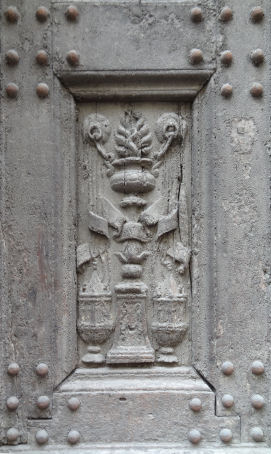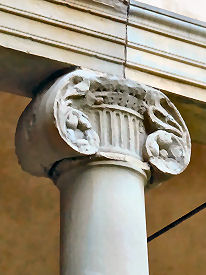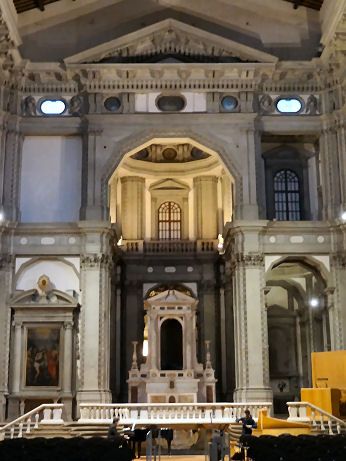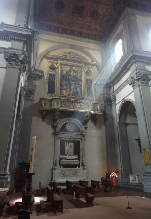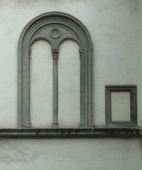 Relentless rain this morning. Our new gang of four having decided to go some separate ways before our Uffizi visit this afternoon, I ventured forth fearlessly to - surprise! - visit some new churches. First was Sant'Egidio in the Ospedale di Santa Maria Nuova. It had a double-tier nun's gallery at the back, which I'd not seen before and an Allori altarpiece most dingy and in need of cleaning. Mannerist painters have become more appreciated and less spurned in recent years, but their works ain't getting the cleaning they deserve in churches here, it would seem. ![]() Then I found my way to Santa Maria Maddelena dei Pazzi, through the deserted big cloister (with its weird column capitals, see right.) to the huge and empty church. I had the place to myself for my whole visit - no visitors, no-one keeping watch. It's a big aisleless box and too dark to make out much painting-wise. I liked a Coronation of the Virgin by Rosselli, but that was probably because what little light there was was shining on it. The fresco-covered left-hand transept chapel looked good too, what I could see. (Should I have brought a torch?) The chapel opposite was frescoed nicely too, in a mannerist/post-Michelangelo style. The rain had stopped when I left the church, thank the lord. On my way to Sant'Ambrigio I passed the Synagogue, and...wow - it's big, and has lovely grey railings (see above right). Sant'Ambrigio turned out to be a little gem. Small and aisleless but with four chunky dark grey tabernacles down each side, most containing earlier fresco fragments. There was also a big sinopia (fresco background drawing) hung near its actual fresco, by Cosimo Rosselli (see right). Fascinating and impressive. The paintings and fragments are mostly well labelled, even if these are all a bit eccentrically translated. The noisy fountain just inside the door I could also have done without, at this stage of the morning, bladder-wise. And then, although it was only 11.30, we were chucked out, much to the grumbling disgust also of the two elderly women who'd just come through the door intent on actual religious activity. Out of this church to sunshine! Briefly. Hoovering up some nameless churches on the map in my guidebook (one of which nonetheless has some fine worn door panels, see below right) I also happened across the market out here, which was mostly fruit and veg, but with general junk too. Slowly back to the hotel, picking up a mozza/tom panino and an apple and almond tart, for a hotel-room picnic. We'd booked our Uffizi tickets in advance, so it was 'just' a matter of ignoring the plebs queuing at door one, going across the courtyard to door three to convert our print-out into real tickets, and then coming back to join the (short) queue at door two. Then we had to pass through airport-type security and join a snaky queue to the staircase and then trek up the stairs. Access to the room made from the remains of the demolished church of San Pier Scheraggio, with its display of removed frescos, was nowhere indicated, which was disappointing. There is nowhere quite like the Uffizi for (medieval and) renaissance overload and the earlier stuff is its strength, so I still paced myself badly and had to rush the end bit, but the Bronzino portraits impressed, and the Giorgione/Bellini room is a sea of strangeness and cross-attribution. And if you add the many Giorgiones in Vienna to the three here, all of which were once in Vienna, you have to ask...Vienna - why? Shepherded out at 6.30, we then had to make it through endless displays of tapestries, and about twenty shops. Well, at least four. A final meal in the Grotta di Leo with Helen & Sally. A mess of starters, first courses, main courses, pizzas and a panna cotta all came in no real order, but made for much tasty sharing. With a fond farewell to H&S, we contemplate the journey home tomorrow. But with fortitude and courage we will face the...OK, enough of that. |