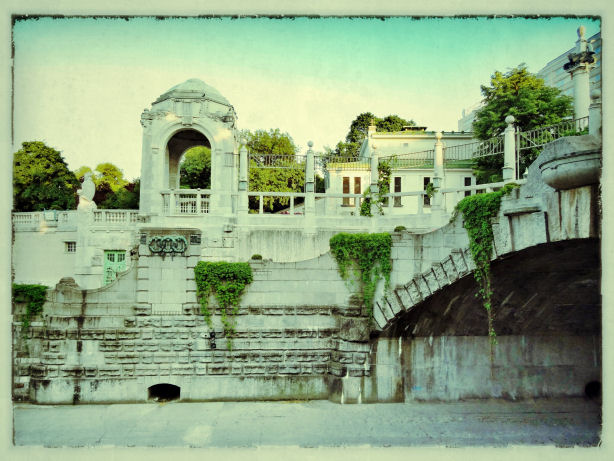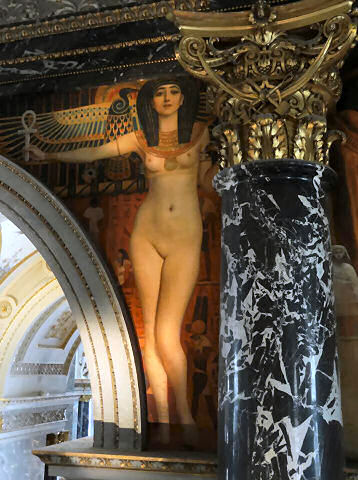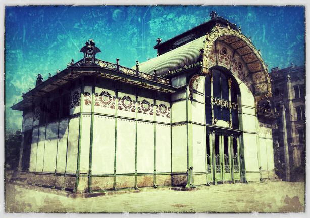 Day 5 More Hotel Stefanie breakfast details - large bread selection, three breadbaskets in total, seven sorts of jam, and three honeys. Today I tried what looked like soft rolls covered in sugar, which were that. Jane's fave of scrambled eggs on toast is here improved by choice of four types of rye loaf, smoked salmon, and a squeeze of fresh lemon.. To the museum of the history of Vienna today, passing the lovely Otto Wagner Karlsplatz station buildings (see one right). The museum was pretty darn fascinating, in a Museum of London/Musee Carnavalet style - maps, paintings, shop fittings, stained-glass windows - you know the stuff, but with more models of the whole city than usual. And an exhausting Klimt exhibition, mostly of drawings, but also featuring a display of items voted for in the Tackiest Klimt Souvenir poll. The winner is a mock Faberge egg that opens to show a model of The Kiss whilst its music box plays Elvis's I Can't Help Falling in love With You. A tasty mozzarella toast (with ketchup) in the tasteful museum cafe was lunch, and on the way home, it being 80-odd degrees, ice cream was necessary, almost essential. Jane had raspberry, and I had two flavours: apricot and poppy-seed. Never had the latter before (it looks like stracciatella) but I can reveal that it is delicious, but that if it melts on your hand you look like you have a strange skin disease. |