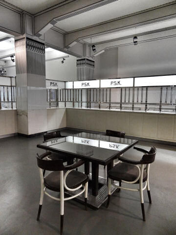 Day 7 On our way to the MAK we visited the PSK. Otto Wagner's Austrian Postal Savings Bank (see right) is one of his finest buildings, is full of nice details, and has an interesting small museum. Also the gift shop sells a watch that reproduces his banking hall clock and is very stylish. And is on my wrist as I type this. I think that it might be the nicest watch in the whole world, in fact. The MAK is the museum of applied art, like a Viennese V&A, only smaller. Some good and worthwhile stuff, though, surveying periods from the renaissance to the Wiener Werkstätte. Also Klimt kartoons, Otto Wagner furniture, lovely ceramics and glass, swathes of chairs ... we enjoyed it. In the museum cafe we had some dainty pasta (linguine with asparagus for Jane, herb and ricotta ravioli for me) with some superior seedy bread coming unasked-for to start with a small dish of lovely horse-radish flavoured cream cheese. And they had fresh pear juice too. Verily an uncheap treat. An odd little sweetie and cake decoration shop we passed resulted in the purchase of bags of black and white marzipan pebbles, 'green' almonds in yoghurt (which turned out to be chilli flavoured), and those soft-centred crunchy fruit sweets you had as a child, but here with flavours like mandarin, apricot and pineapple. |