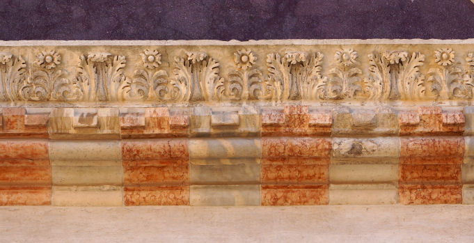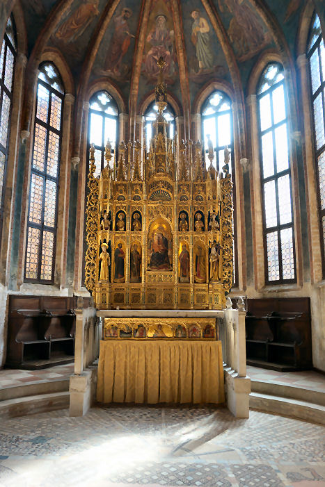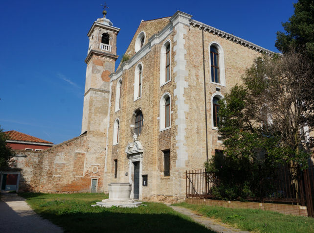 It was standing room only on vaporetto 42 to Murano this morning. I went there because regular correspondent David Orme had found the church of Santa Maria degli Angeli open earlier in the year, on a week day, and not just for a service. He was lucky, I was not. Oh well, I took its picture anyway, looking handsome in the sunshine, (see right) and made my way to Santi Maria e Donato. The floor is the draw here, and the wonderful back end outside. Inside there were many red ropes strung around the pews to make negotiating the place in search of a sit down more akin to finding your way through a maze. Odd. Saint Donatus is the patron saint of Murano so his remains and the bones of the dragon he slew by spitting at it are, of course, in the church. To San Pietro Martire too, as I'm never one to pass up a Bellini. The other Bellini, which I've never seen, The Assumption of the Virgin, is still away in restauro, an attendant tells me. They sure are making a good job of it! The sacristy and museum where open, though, and so I paid my €1.50 and admired the carved dossals and some interesting displaced altarpieces; and paid not too much attention to various cases of vestments, goblets and reliquaries. Back on the 41 vaporetto to Fte Nove. Walked past Titian's house, according to an inscription above a garden door. This seems to be my trip for finding artists' houses. Too early for lunch and so passing the Miracoli I went inside. Always a treat - them Lombardos sure knew their stuff. Just as some couples know how to have a row about whether or not they're going into a church, when I just want them to go in or go away so I can take a photo that doesn't include their unattractive shapes and colours. Over the Rialto for a €1.50 pee. My lunch pastry thing, for the making of which no animal was harmed, was filled with ricotta, tomato and mozzarella. This was bought at the place which makes the Marzipan tarts, and so you can guess what I was doing in there. And my walk back took me by the gelateria behind the Frari and so I had dark chocolate and coconut - good separately, but together...