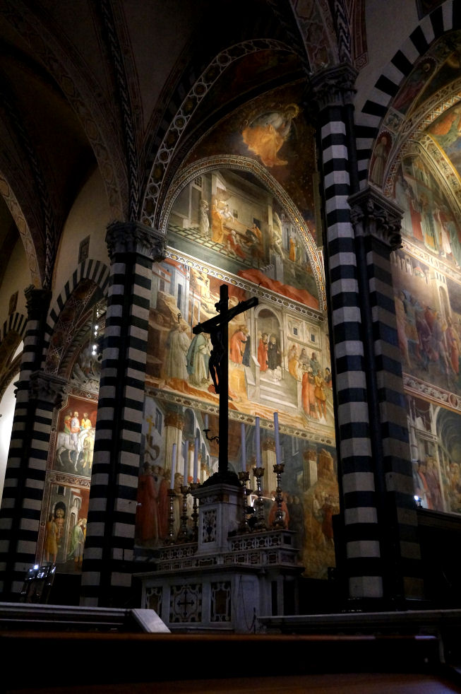 Today I went to Prato, a trip I'd been promising myself since getting keen on Filippi Lippi, due in no small part to reading A Gift for the Magus. The train from Florence SMN takes 20 minutes and costs €2.50. It was pretty full, and in no time I was surrounded by a pack of scouts who were unusually well-behaved, maybe due to the presence in their group of female scouts. The walk from Prato Centrale is not pretty, but it's not far. (The next station after Centrale is nearer the historic bits, I later found out.) I was looking for the art gallery and/or a tourist information point first - a map or some art, either would do. Not finding the info place I went into the prettiest building I could find, the Museo di Palazzo Pretorio (see right), to ask directions, and it turned out to be the gallery I was looking for! It has several floors, the first has the gold-ground altarpieces, the Filippo Lippi paintings, and basically all the best stuff. There's a room here which explains all the Holy Girdle stuff pretty neatly too, with the help of a Bernardo Daddi predella. The next floor gets later and goes a bit Allori and Santi di Tito. The top floor has some impressive cartoons by Alessandro Franchi, a new name on me but he was like a Pratese pre-raph, with a chapel frescoed by him in the Duomo, where I was heading next. ![]() The Cathedral of Prato is dedicated to Saint Stephen, so he gets featured in a lot of the frescos. The left wall of the apse is frescoed with scenes from his life by Filippi Lippi, and the right wall with his more famous scenes from the life of John the Baptist. These are the highlight cycles, and I lingered long. €3 gets you good gazing-up access to this chapel and the pairs either side. There's the Assunta Chapel, done by Uccello, which is worth a good look too, although one side was finished by one Andrea di Giusto, who seems to have been an inferior hand. There's also the Vinaccessi chapel by the aforementioned Franchi, which is very 19th Century, but I liked it. The church itself makes up for in height what it lacks in width, and by the door is the jazzed-up chapel which contains the Holy Girdle, or the Sacred Belt as the church's leaflet has it. It's frescoed all inside by Agnolo Gaddi, with scenes from the Life of the Virgin and Stories of the Sacred Belt, but you can only peer through railings at them, although putting money in the light helps. It was now nearing 2 o'clock and so I decided to quit before I got knackered. Making for the railway station through streets deserted as only streets in an Italian town on a Sunday afternoon can be, there was a bit more activity in the park by the station - mostly women in clothes too sparkly, skirts too short, and heels too high for a summer Sunday afternoon, I thought. The station bar provided me with a very crusty panino of mozzarella, tomato and basil, which I shared on the platform with a pushy sparrow in the twenty minutes before the train came. Said sparrow chirped raucously to alert me to his presence and hunger, and then when he'd finished what I'd chucked him he was back and chirping some more, or maybe he'd sent a mate. Back in Florence I popped into Lindt to see if they had anything that might go with my afternoon tea, and lo they had a bar made of white chocolate with a coconut and pineapple filling. It turned out to be a bit icky, but edible. My evening walk was a bit unplanned: one of those 'I can't decide, maybe I'll get inspired when I get outside the hotel door' situations. Getting to Santa Croce was not the best bit, but I went around the back and down to the river and had a nice and dusky walk with many photo opportunities back to the Ponte Vecchio. The street sellers of tourist tat now range themselves along the north bank pavements quite far east, it seems, to try and catch the final euros of the day-tripper parties heading back to their coaches, as the nearest they can park is beyond Ponte San Niccolò. |