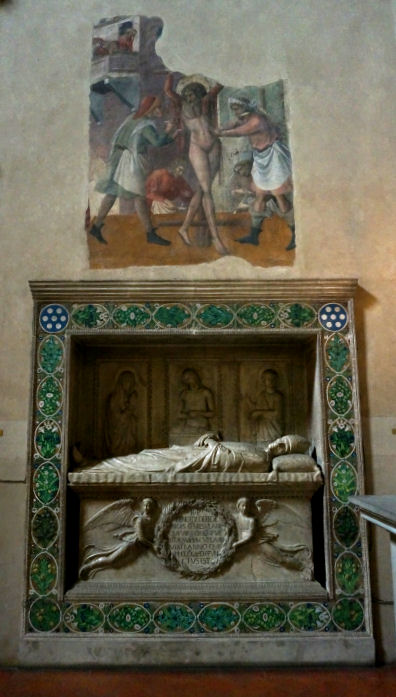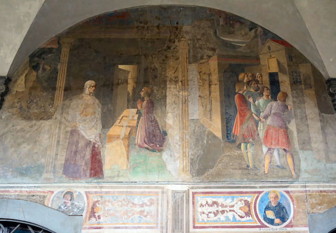 Some churches today, I thought. Making eventually for Sant'Ambrogio I stopped off at Santa Trìnita first because it's such a favourite. As usual it was quite quiet, and as usual I couldn't get out in under half an hour. The Ghirlandaio frescoes, of course and the Lorenzo Monaco ones too. But this time I noticed all the works of Neri and Lorenzo di Bicci and how most of the fragmentary bits of fresco, including those high up above the end wall chapels, are by Giovanni dal Ponte. Also special is the tomb of Benozzo Federighi, Bishop of Fiesole, by Luca della Robbia (see right) with its impressive enamelled terracotta mosaic frame. It shares its chapel with a couple of bits of martyrdom frescoes by - him again - Giovanni dal Ponte. In a burst of pushiness I asked the man if he would let me into the sacristy, which he seemed happy to do. It's a pleasingly tall space, which used to be a Strozzi chapel. It's pretty bare, but there are some detached frescoes in here, and the tomb of Onofrio Pazzi by Lorenzo Ghiberti, commissioned by his son Palla, who was banished after the revolt in 1434 against Cosimo il Vecchio. Palla was one of 500 who were banished, and he died in Padua. The tomb is decorated with flowers painted by Gentile di Fabriano, who also painted the Adoration of the Magi (now in the Uffizi) for this chapel. I admit to needing a map to find San Remegio again, but I did. It's a nice and chunky and modest little gothic space, but with appealing fresco fragments, of course, and an early Madonna and Child altarpiece that's been attributed to Duccio, Cimabue and Gaddo Gaddi (father of Taddeo) in it's time, but now is given to the Master of San Remegio. I ended up with under ten minutes in Sant'Ambrogio before we were all chucked out, which always seems to be the case. I must get myself organised one of these years. Just time to do one quick circuit, admiring the big Rosselli frescos, and sinopie and a lovely little Madonna del Latte two altars down on the right, and that was it. Attracted to the bookshop opposite I was a little soothed to find a sweet book on the cloisters and courtyards of Florence, dual language and half price, and a book on Florence's churches in the same series, which didn't just do the usuals. This book wasn't marked as half price, so I asked, and the nice lady halved that one too. Me - bartering! And asking to be let into a sacristy! Both in the same morning! Exhausted by all this pushiness I headed through the market (deciding not to try my luck negotiating a reasonable price for a pannet of cherries) and passed Santa Croce on my way to the Ponte Vecchio and over to Mama's Bakery for a repeat of my lunch of Saturday, except the takeaway cake was an apple muffin. The gelato was pear and ricotta with lemon - the pear was a bit pear-droppy, but thereby held its own with the tang of the lemon. My Blue Guide tells me that the Badia Fiorentina, although often open for prayers and reading monks, is open for visitors, including the Cloister of the Oranges, on Mondays from 3.00 to 6.00. So after my typing-up, tea and cake, but before my snooze, I'm back out and over there. The church has a highlight Filippino Lippi painting, some oddly fine tombs by Mina di Fiesole, some detached fresco fragments (if I had a quid for every time I've typed those three words this trip...) by Nardo di Cione, and some architectural frescoes in the choir that are almost Piranesi-ish. But then you go up to the gallery of the aforementioned cloister and...wow, what frescoes! Not sure why they're not more well known, possibly because they're not by a known, or even named, artist. They tell the life of Saint Benedict, a saint responsible for some of the odder miracles, like the early one where his nurse breaks a sieve and he mends it with prayer, and so it's hung over the church door to encourage veneration (see below right). Well, that's my Monday afternoons on future trips to Florence sorted. Essential.