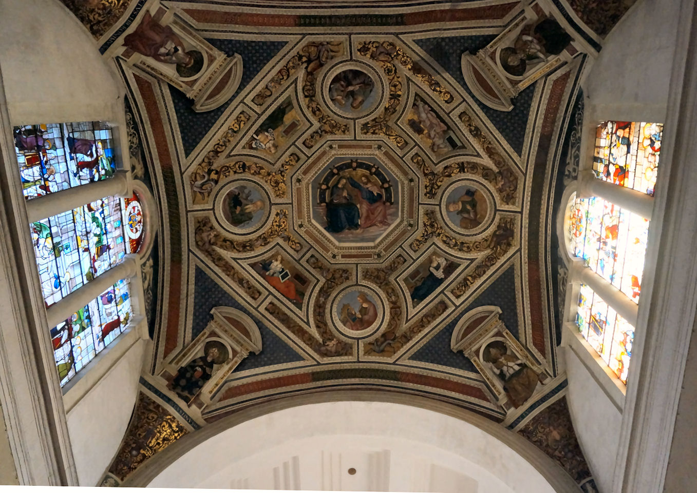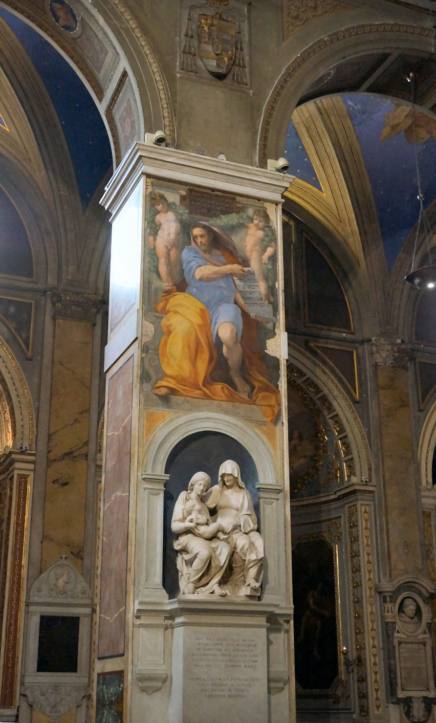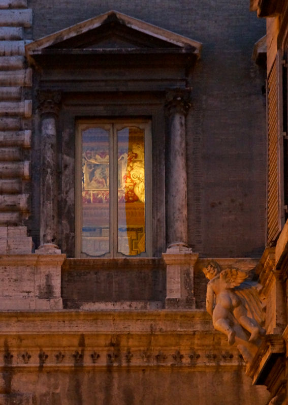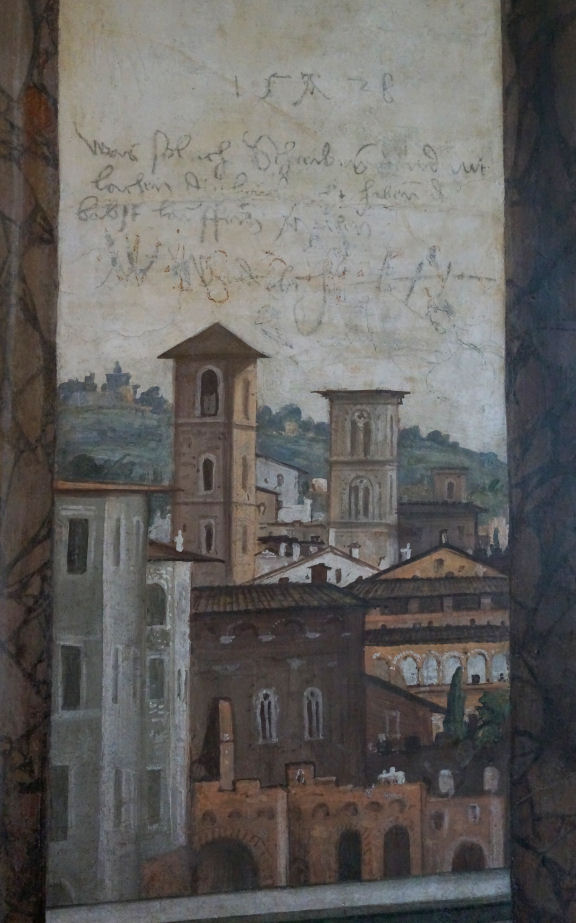 Wednesday 25th February Having visited Rome just the once in 1994 this revisit has been a mighty long time coming. It's an art-historian guided tour courtesy of Art Pursuits, lead by Joachim Strupp, who runs the company and, as I'd discovered mere weeks ago, gives tempting and trip-encouraging lectures on the Roman Baroque, amongst many other tasty topics, at the V&A and elsewhere. An untroublesome journey to Heathrow, which is very much not my favourite airport for getting to at the crack of dawn. I did learn, however, not to trust the train indicators on Piccadilly Line platforms - it's the trains themselves that tell the truth if there's disagreement. I met the tour people at the airport, went through security pretty swiftly, had an Americano and a berry muffin, the flight was on time...you know the drill...when it goes well you barely lose concentration on your book reading. Arriving at Rome Fiumicino there was quite a queue at passport control, but I skipped through as there was no-one going through the EU automated gates, which was a weird reversal of the usual experience coming into UK airports. Two buses and a car took us all to San Pietro in Montorio on the Janiculan Hill for some pre-hotel culture. Some good sweeping views, an unusually impressive Sebastiano del Piombo altarpiece of The Flagellation and Bramante's famous Tempietto. All very refreshing for the soul, and then we walked down the hill through Trastevere, getting the flavour, and over the river to our hotel, the Ponte Sisto. There is a gelateria just opposite, my bathroom is well marbly, the desk in the room has enough drawers for gadgets and leads, and outside my window is a pedestrianised street, so you can open the window and get chat and a distant (instrumental) busker but no loud traffic, which is just what you want for background atmosphere whilst typing this stuff. What you don't need is to learn that because your memory card was not properly pushed home none of the photos you took this afternoon have come out. And the camera didn't warn me. Bastard! Hence the white space over on the right, until my evening stroll. The group evening meal, at a restaurant called Ditrambo in Piazza della Cancelleria was good for erudite chats (about art, cakes and cats, of course) but the food was special too. The best veggie food I've had in Italy that wasn't a pizza or a bowl of pasta with sauce but was, well, different and flavoursome in surprising ways. And then there was the chocolate cake. All of which nicely makes up for the fact that I've not been able to post this up on my website yet, due to technical difficulties. Maybe tomorrow. (This problem never was resolved, so this all went up when I got home.) Thursday 26th February Before the day begins I have to report on the Hotel Ponte Sisto's breakfast. You know how I judge so: orange juice - not bad but not truly freshly-squeezed; cereal - muesli and cornflakes OK; croissants: only the pre-filled sugary sort; pastries - small but fresh, and often still warm. So, acceptable, but not special. Our first stop was the Casa dei Cavalieri di Rodi, built for the Knights of Rhodes but now housing their successors, The Knights of Malta. It's not the easiest place to get into, but the excitement that that phrase encourages was somewhat quelled by the first room we went into - a boxy and functional plain space. But the loggia up the stairs was truly a treat, with some spectacular views (see right) and fascinating frescoes on the internal walls. These latter were very pale and weather-worn, but the fragments were tantalising for being almost totally decorative and depicting landscape. On our walk to the Colosseum we passed a pack of film crews, one of which insisted on accosting our leader, Joachim, and interviewing him about Beppe Grillo - the Italian comedian and activist who makes our Boris Johnson look like a serious politician. They were waiting outside the hotel where he was staying. The Colosseum we appreciated from the outside circling around it and then we went into and around the Forum. Joachim did a mighty good job of telling us good stuff we didn't know, and Nicola brought us cans of Lemon Soda and chocolate biscuits half way through. All hail them both! Lunch in a fine wood-paneled joint called the Abbruzzo was, for me anyway, some lovely fresh gnocchi in a tomato sauce. Good bread too, and an espresso to provide stamina for the afternoon visit to the Pantheon, which is always impressive. It's lack of any good art was made up for by a visit to Santa Maria sopra Minerva. On the way we made a stop for essential gelato, which I'm pleased to report that most of our party took advantage of. Me I went for scoops of cinnamon and pear, and it was fine. S.M sopra Minerva was the artistic antidote to the Pantheon because it has the very special Carafa Chapel frescoed by Filippino Lippi (see below) and a lesser-known Michelangelo statue of The Risen Christ. The latter is oddly muscular and nude, with a plasterwork cloth over his ![]() private parts, which has not, like most such additions, been removed, presumably because it's still in a church. This church is also the burial place of Fra Angelico, with a large tomb slab, so a bit of an art pilgrimage destination. Then all back to the hotel for some resting. After which a meal with a select bunch of us at a restaurant called La Quercia - mixed starters for first course (for me the veggie options were fagioli in tomato sauce, a little bruschetta, mozzarella balls, and a vegetable flan) then mixed veg and tagliatelle topped with parmesan for main course. Very flavoursome. And as we were not the whole party, and our leader Joachim was not there, we were able to have a good gossip about the party members not present, especially Joachim! Friday 27th February Today was looking like, pardon my prejudice, the centrepiece of the trip, it including an evening just-our-group visit to Raphael's stanze and the Sistine Chapel. To add to it's exh