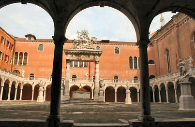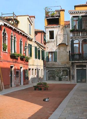 Tuesday 26th September The builder arrives, not late, and confirms that there is a problem with the gate and that he'll be back later today to fix it, but after checking the gate in my bit he needs me no more. So I'm out - the weather not looking too bad - thin cloud with blue tinges. Stroll and wander up towards San Zanipolo and find myself in an area I was not previously familiar with, which is always refreshing. Especially when it has many photo opportunities and a rambling and slightly ramshackle big bookshop with three cats lounging on the stock. I asked the owner the Venetian cat question (where have they all gone?) and he confirmed the story of the ecologisti and the island cattery. He shared with me the picturesque view out of his watergate and said that the water level was rising, a thing he could tell by the direction the flotsam moved past his gate. I left the shop with a few tasteful and architectural postcards and found myself standing respectfully by as a funeral barge pulled up and the coffin and family made their way into the church. On a previous trip I saw a gondola wedding but this was my first funeral, although the boat was a plain blue motorboat and not the black and plumed affair that some famous films had led us to expect. Venturing deeper in Castello I came to San Francesco della Vigna. A church I'd not been in before. It has a fine big and plain interior, with some nice art, including a Bellini, Virgin and Child with Saints, which is decidedly uninferior. And there are two cloisters! I'm a sucker for cloisters and Venice doesn't seem to have that many. After some takeaway pizza (olive and onion) with a bottle of peach iced tea sitting on a wall by San Zanipolo I treated myself to an ice cream coppa of cocco and lampone and came back to the flat for a siesta, after some tea and...