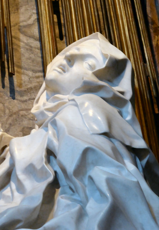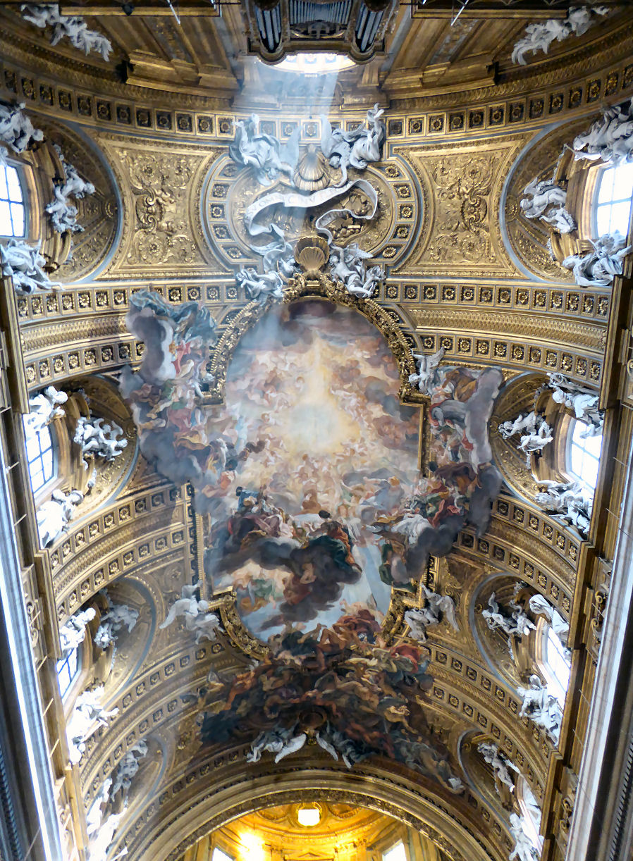 to whet anyone's expectations. Saturday 20th February I had decided to stay overnight near the airport, to make things less of an early-rising rush, so after an eventless journey across late-evening London I'm in the Hilton Garden Inn in room 137, which is comfy, with two double beds, for some reason, and a fine view of the car park and lots of soulless airport-related non-landscape, but lots of sky too. So I leave the curtains open hoping for a sunny morning. Sunday 21st February But at 7.00am full day had yet to dawn. The night had been plagued by a loudly talking Chinese couple, who also decided to listen to the radio at 2.30, and a screaming baby briefly. Let us all praise earplugs yet again. The shuttle bus made it to terminal 5 in 15 minutes. It costs £5 paying the cheerful driver but would be £4.50 from the grumpy machine in the foyer, if it was working. Meeting Joachim, bag drop, security, and the consuming of a coffee and almond croissant all followed in tidy order. In-flight snack was a miniature cheese and chutney roll and a matching orange-iced chocolate bun. Patrizia, our tour manager, met us at Fiumicino and then we were minibused to our hotel, the Ponte Sisto like last year. My room is courtyard-facing and this afternoon as I unpacked I had the windows open, the light shone in, and the seagulls made a racket. Nothing like seagulls to make you feel you're on your holidays. Joachim took us on an acclimatising afternoon walk, taking in a visit to the Chiesa del Gesú - a good jaw-dropping bit of baroque ceiling decoration by Pozzo to get us started (see photo right). And the perfect late-afternoon light did good work too. The first-night dinner at the Ditrambo was less special food-wise than last year. The starter was mound-shaped things supposedly of chicory and pumpkin but tasting a bit generic. Whilst the carnivores tucked into veal and suckling pig (a gross and somewhat medieval combination, I thought) I was offered pasta al funghi, vegetarian lasagna, or ravioli. From that somewhat unimaginative Surrey-pub-lunch selection I plumped for the latter, expecting an imaginative filling, maybe, but it was spinach and ricotta, and in a starterish portion. Monday 22nd February ![]() Breakfast featured good fresh pastries, and they were small, so having many seemed advisable; and the orange juice was better than last year. We began by walking to Sant'Ignazio, in its lovely little piazzetta, which got our day of ceiling painting off to a spectacular start, with another one by Pozzo. We then took minibuses to Santa Maria della Vittoria to look at Bernini's famously erotic Ecstasy of Santa Theresa (see right) in the Cornaro Chapel there. After coffee we admired Santa Susanna's exterior and then made for San Carlo alle Quattro Fontaine, after admiring said four fountains. The church amply demonstrates the way Borromini had with the baroque, in ways not obvious but enlighteningly explained and appreciated by Joachim. After a substantial lunch in a joint called Berzitello we walked to the Casino dell'Aurora Boncampagni-Ludovisi for a specially arranged visit, guided by the Principessa Rita, the American wife who's led a somewhat racy life. She showed us ceilings by Guercino, Tasso (aka Artemisia's rapist) and Carravaggio (recently uncovered) and digressed muchly, but charmingly, with that American way of stressing the superlatives. Minibuses then took us to the Casa Professa and so back to St Ignatius (his cell is preserved here) and our man Pozzo, who painted a corridor here - walls and ceiling - with as much boggling illusionistic trickery as this morning's ceiling. Tuesday 23rd February First visit this morning was the Palazzo Colonna, which had bigness, many ceiling paintings and much stunning art - a Cosme Tura altarpiece side panel and paintings by the likes of Pisanello, Tintoretto, Veronese, Bronzino, and Annibale Carracci. And ending with a Great Hall with another boggling ceiling painting. Verily a collection with no noticeable duds, and refreshingly expertly shown to us by Dottoressa Barberini. There was a small view painting of Venice which, smarty-pants that I am, I noticed had been mis-titled. It said Campo San Rocco, but was plainly San Salvador. After coffee we took in the the Trevi Fountain, the Piazza di Spagna and the Spanish Steps. For lunch we went independent and me and Michael found a place nearby to eat panini outside and watch two fire engines, one with a ladder, attend a fire up the street. This excitement we followed with a gelato (mine ricotta, honey and nut combined with coconut). The afternoon took us for a walk to Palazzo Barberini, the Galleria Nazionale, to see works by Carravagio, Baglioni, Saraceni and Carracci. And a ceiling by Pietro da Cortona. Our visit was nicely rounded off by a Borromini staircase and two ginger cats, one friendly one not. Then minibuses took us to Santa Maria del Popolo for a couple more dark panels by Caravaggio, in the Cerasi Chapel either side of a glowing Carracci, and then we were minibused back to the hotel and some well-earned collapsing. In the evening Patrizia and Joachim took a bunch of us to a fish restaurant. I am the sole vegetarian this trip, and another two of us didn't eat fish. But fried potatoes (which turned out to be more crisps than chips), fried battered vegetables and some acceptable spaghetti in tomato sauce kept us happy. As did the (for me) good and fresh cannoli, my first experience of the real thing. Wednesday 24th February The return of the old (and still puzzling to me) gout this morning, which I've not had even a twinge of since last year's trip to Verona. Why does it always strike me on trips? I've drunk a deal more prosecco and wine in the past few days than my more usual none-at-all, so that might be it. So, painful around the right big toe joint, it was first by minibus to Sant'Andrea al Quirinale, also known as the one by Bernini that's ellipse-shaped and wider than it's long and the archit