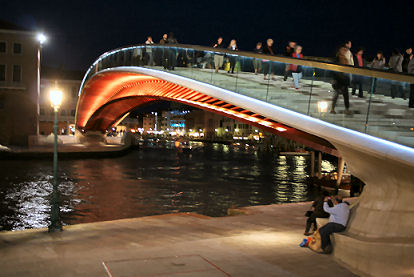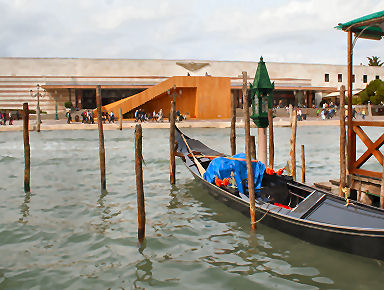 Wednesday 17th (I've resisted the temptation of that Jeff in Venice title for so long. It's a bad pun, I know, but it's also the title of a new novel coming out in 2009, so I thought that by using it I might also pick up a few confused searches later on.) Apart from the 5 o'clock wakeup my journey went without snags. The security-check queue at Gatwick was short and swift, but just as I was putting my belt back on after the scanning arch, and so about to attain trouser-security, I was asked to take my shoes off to put them through another x-ray machine and then an apologetic chap with a clip-board started asking me about my destination and the length of my trip. Phew! So, Venice in no time (well an hour and fifty minutes), no queue for bus tickets, and the only small blight the annoying man on the bus faffing loudly about paying a Euro too much for his bus ticket with a different company and then having an exhibitionist mobile-phone call to his secretary, so proving how important he is, even when he's just about to start his holiday. Pshaw! My hotel, The Locanda Gaffaro, is but a five-minute walk from Piazzale Roma. My room is not going to be ready until one o'clock, the chap with the unwarm manner tells me, so I ditch the case and the laptop and head out for some lunch and reassurance. I am soon reassured that Venice is indeed still special, and I buy an ordinary slice of pizza and sit in the campo by the Frari façade and eat it. Entertainment is provided by a chap with a guitar singing what sounds like a very early Eagles song, but which I eventually recognise as Wish You Were Here by Pink Floyd. Soon someone comes and sits and smokes near me, as they always do, so I move off. As I'm just aimlessly wandering my feet slip into the groove to the Rialto and then on up to the railway station. Near La Maddalena, in the main drag up to the station, from a place called Il Gelatone, I have my first gelato - fior di latte and lemon sorbet, and very subtle the flavours are too, especially the nicely un-sherbety lemon. In front of the station there's a weird huge free-standing staircase made of wood (see above right). I take some photos from it, just because I can. On my way back to the hotel I buy some Nicolotta Veneziana - basically Venetian bread pudding, but not so spicy. I notice that the controversial new Calatrava bridge is now open, so the stealthy non-celebratory opening happened after all. Pah! Back at the hotel the man with the borderline-surly manner books me in and my room is fine - not huge or plush but it'll do. It's down a short corridor behind the reception desk, which might be a noise problem, but I'll see what kind of a night's sleep I get. I brew myself some herb tea in my plastic tooth-mug (must get a proper mug) using the water-boiling thing I bought several trips ago and settle down for tea, cake and little rest. An early-evening walk to San Marco, of course, checking out the scaffolding on the way - the view towards the Salute from the Accademia bridge is now even more blighted (see right), there's unsightly stuff around the bottom of the campanile in the Piazza, the part of the front of the Doge's Palace where the chunk fell off is still all scaffolded over, and the Bridge of Sighs is hemmed around by an abomination of blue advertising hoardings. Sigh! |
