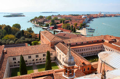 Saturday 20th I thought that I deserved a bit more sleep, so I had set my alarm for 8.30. But even through the earplugs I was awakened by knocking on my door soon after 8. I ignored it thinking it was a mistake. Then there was more. I got up and answered the forth lot. A different young guy at the door tells me my breakfast is now cold and he will warm it up. When he returns (the kitchenish area is right next to my room) I tell him I thought he was supposed to bring it when I ring and say I'm ready, he says he understands the contrary. The toast is cold and the coffee tepid. I question all of this with Mr Grumpy on the desk later in the day and he says I'm down for breakfast at 8.20. No-one had told me this, I say. The 's' word still doesn't pass his lips. But the sky is blue, the sun is out, and I'm off boating. I buy a vaporetto pass for 48 hours and head from Piazzale Roma around the back, as it were, to the Zattere and over to Giudecca. My first church is Santa Eufemia which has a surprising interior of an old shell bellow, with old columns, contrasting with the flouncy rococo decoration above - all white, pale green and gilding. This effect is accentuated by the plaster on the lower part of the walls having mostly been chipped away to reveal the rough brickwork. The paintings around the chancel are uninspiring works by some followers of Veronese. The art highlight is Saint Roch and the Angel by Vivarini (which was the central panel of a triptych, the info in the church tells us) with a lunette above of The Virgin and Child. This sheet of facts also tells us that The Birth of Christ and The Adoration of the Magi by Marieschi are 'no longer in place' and that the ceiling panels are by G. B. Canal a follower of Tiepolo. There's also a Morleiter statue of the Pieta, where the body of Christ rests on a rock rather than in the usual maternal lap. The Doric portico which faces onto the Giudecca Canal was recently restored, but still looks very grubby. I then walk around photographing closed churches and stroking a fluffy and orangey tabby cat who was appreciative but also busy chewing grass, so I thought I'd leave him to it. I went and looked wistfully at the ever-locked gate of The Garden of Eden, my page devoted to which is one of my top correspondence-generators. One day we'll get to see inside, I am uncertain of that. I might have gone into the church of the Redentore, but there was a swish wedding on, one of the drawbacks of Saturday church visiting, I suppose. So I caught a vap to San Giorgio Maggiore instead. The interior is stony and monumental, with white walls and thick clusters of supporting columns and pilasters. On the right as you enter is an Adoration of the Shepherds by Jacopo da Bassano, an atmospheric night time scene that benefits greatly from a .50 euro coin in the light. Opposite it is an odd Martyrdom of Saint Lucy by Leandro de Bassano, one of his four painting sons, which depicts strong men and oxen trying to move the saint with ropes. I went up the campanile too - 3 euros and there's a lift - for some stunning views over Venice, and into the nearby cloisters (left). A no.2 vaporetto came along, going back through the Giudecca canal and around to the bus station and along the Grand Canal. So I got on, got a seat right at the front, and had a good long ride in the sunshine, all the way to San Marco. Opposite the Peggy Guggenheim, in the garden of a swanky hotel, there were crowds of well-dressed guests, maybe from the wedding I'd seen earlier, with so many police at the water gate and in boats that the man sitting behind me said 'Look, that building must be the police station - nice!' I walked back from San Marco to the Accademia Bridge, noticing that there was confetti outside San Moise too. Imagine getting married in San Moise! I suppose it being such an ugly church means that your guests can't help but look good. I bought a slice of pizza at a fave joint by Campo San Vio, and took it to sit on my favourite bench on the campo looking over the Grand Canal at my favourite stretch of palazzi opposite. Sigh. A man came and joined me on my bench, with his own slice of pizza, and fed the same sparrows, pigeon and seagulls that I'd just been feeding. But then, of course, he lit up a cigarette. I headed back to my hotel west along the Zattere and then up. On the way I picked up a very superior pear and stracciatella ice cream from Nico. But I forgot to get a cake! |