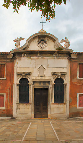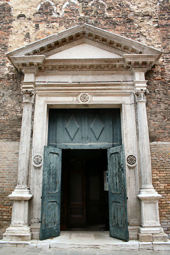Sunday 21st I woke up before 8.00 this morning and as I was pootling around and waiting for 20 past I noticed a vivid red splodge on my pillow. After checking my head for leaks I realised that I must have squashed one of the mosquitoes that have been finding my arms and head so delicious these past few nights. Hah! I was having a bit of a dither about today. I had another day left on my vaporetto pass and originally planned to go to Murano but it occurred to me that a Sunday might not be a good day for this as there would be services, and so I might go all that way and not get to see the famous and reputed Giov Bellini painting. The other option was to boat it up to the Eastern part of Castello to photograph the last church I needed, which is so far east it's barely on land. I decided that Sundays, especially cloudy and cold Sundays, are days made for photographing church exteriors, so I might as well go and 'do' Murano. I caught the vap that went around through the Giudecca Canal and on around the East end of Castello, and I spotted the church I need to photograph (Sant'Elena) and even from the back it's clear to see...it's covered in scaffolding! So a wise decision to not trek out there, and a wasted journey thereby prevented. And then as the boat chugged in to the Ospedale stop, an even more fugitive church, Santa Maria del Pianto, which is always closed up and hidden behind a high wall, turns out to be visible partly from the water, and photographable. My cup verily runneth over! On Murano I photographed the lovely Basilica dei Santi Maria e Donato (see far below right) where a service was on, and then found the crumbling and disused Santa Maria degli Angeli. (This is all a mite confusing, as my list says that there's a church called Santa Chiara but doesn't mention Santa Maria degli Angeli.) By the time I got to San Pietro Martire the morning service was over, which meant that the believing people were leaving, and other people with cameras and guidebooks were drifting in. So did I. (The door I drifted in through is pictured above right.) The outside is plain and barnlike, but the interior is impressively spacious and tall, with a deep chancel and side chapels. The ceilings are wooden and the walls have painted friezes over the arches and below the roof line, like in Santo Stefano. There are lots of big chandeliers, of course. Two huge paintings face each other across the aforementioned deep chancel, and there are paintings ranged around the walls, except where the famous Bellini should be, the one I had looked forward to seeing for... I ask where it is, and am told that it's gone to Rome for the big winter Bellini exhibition. Sigh! Walking back to catch a vap I spot the cute little building (right). ![]() I get off the boat at Fondamante Nove and head for the nice pizza takeaway place up behind San Zanipolo. I sit and eat my mushroom calzone behind the church, admiring the crumbling house whose garden is the area of grass at the East end of the church, complete with tasteful stone features. On the walk back via the Rialto, I pick up a limone and fior di latte gelato somewhere on the way to San Giacomo dall'Orio and a very fruity apple tart thing, in the campo of the same name. In the evening I decided to use my vap ticket to get me and my laptop to the internet point with less effort, so I caught a no.1 from the bus station to the Ca' d'Oro. The internet place was closed when I got there so I set up on the steps to the bridge outside, but then the owner arrived. After uploading the above and checking my e-mail I got talking to him. I'd mentioned how expensive the cybercafes were in Venice - the 7 Euros an hour I was paying him being about five times what you'd pay in London. This got us onto how expensive everything is in Venice, including rents. He said that he had friends who were well-paid professionals, but had to live in multi-occupancy flats like students. Public transport, even for residents, is shockingly expensive, even worse than London, and if you need a toilet! OK, you can go in a bar but who wants to pay for an overpriced coffee every time you want to pee? This got us onto the growing tourist hoards against declining residents thing, and what can be done. The suggestion that all visitors should pay a fee so that they can't - shock, horror - visit without spending money is just too much like pricing poor people out of Venice. No easy answers, but lots to be pessimistic about. After dropping my laptop back at the hotel I headed off into Campo Santa Margherita and bought a slice of pizza verdura and sat and ate it watching the world and his small dog and child on a bike go by. Grom, a new gelati chain that a friend in Florence had recommended has opened a branch in Campo San Barnaba. They're a bit more expensive than the going Venetian rate, but judging by my pairing - raspberry and extra dark chocolate - worth every euro. It was lovely. Fortified I took a wandering route back and realised that I 'needed' to find somewhere to get something to nibble with my evening tea. At 8 0'clock on a Sunday evening I wasn't holding out much hope, but found a small food shop open. As I waited behind a woman having some meat sliced I noticed in the fridge that the mineral water was 85 cents! This was a local's shop! When the woman had left, leaving a lovely waft of garlic sausage, I'm not too veggie to admit, I asked for one of the strudels from the case on the counter. And it was 1 euro - truly an unshocking price. I noticed some lost-cat posters on his counter and so we got into the other Venice conversation - where have all the cats gone? He was a firm believer in the Chinese restaurant theory, saying that cats, and small dogs, were being stolen to appear on menus in the city. I've heard this one before but put it down to melodrama and/or racism, but he was adamant, saying that the cats can hardly run away, or be run over by a car. I'm not so sure, if only because I've never seen a C