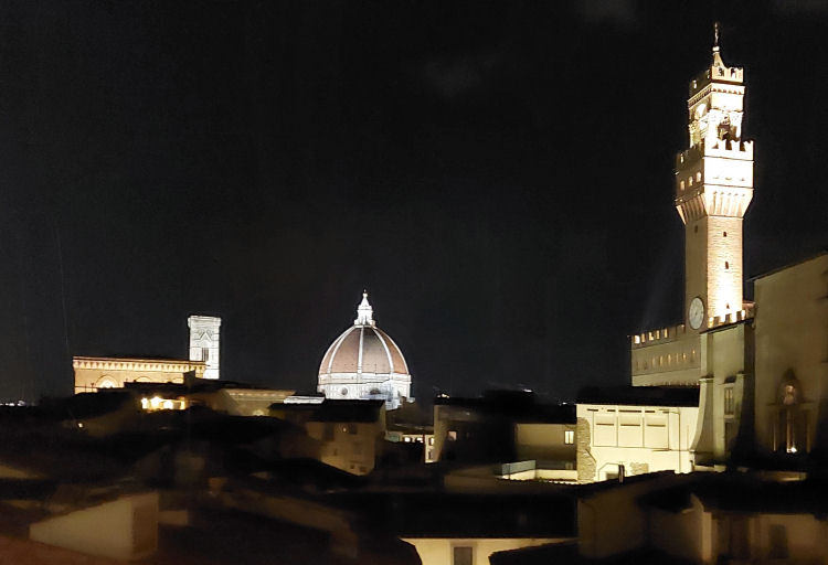 February Off to the Uffizi Gallery this morning, which couldn't be closer to our hotel. The crowds were considerable but seemed to be overwhelmingly Italian. The Lippis, Botticelli, Hugo van der Goes (watch out for a big exhibition next year in Berlin!), Michelangelo and Leonardo were ![]() Post-snooze I headed west for some church photography and visits, preceded by a stracciatella and mandarino gelato. The highlight was time in Ognissanti (see photo right), discovering frescos in the sacristy and the newly-restored tomb chapel of Caroline Bonaparte, Queen of Naples and sister of Napoleon. After some prosecco in the hotel's bar, on the top floor with spectacular views from the terrace (see photo below) our second and final group dinner was at the Ristorante Frescobaldi in Piazza della Signoria, a fish restaurant, but with an imaginative turn of veggie courses - a cavolo nero mousse followed by some black-peppery pasta. Good conversation too, despite a lapse into the subject of grown-up children's courting habits, a subject to which I could contribute next to nothing. Monday 28 February What with the closures and itinerary adjustments our last morning ended up being a visit to the Palazzo Vecchio. Not my favourite Florentine attraction what with the number of works by Vasari on the ceilings and walls, but there's a Ghirlandaio wall too, and Bronzino's chapel. An early return to the hotel to check out was followed by an Oltrano stroll for me, in the sunshine, with churches to photograph, a mozzarella and tomato seedy croissant and a final gelato, coconut and lemon. After coaching it to Pisa Airport the usual queues and crowds ended with finding the enlarged international gate area comfortably empty. What with the increased number of barcodes to be found and scanned boarding took a while, and one of a party of stout chaps, thought to be a rugby team, was left behind because he couldn't provide his jab proof, because of his dead phone. All then went smooth back to London, where it was raining. |