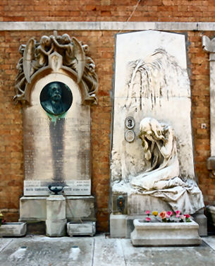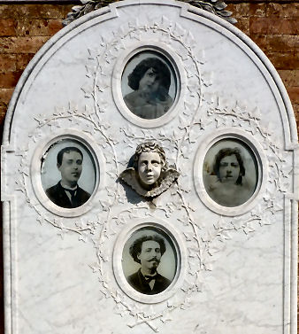 Having been entertained, fed and wined last night in their lovely home by semi-Venetian friends Michelle and Graham, and their friend Kate, I awoke with a head that throbbed lightly. I hadn't overindulged, I'd just mixed my drinks I suppose - prosecco, red wine and some desert wine. Nothing some fruit juice, muesli, coffee and a pain au chocolate couldn't cure though. Then out in the fresh air to explore more fresh ground today with a trip to San Michele, the cemetery island. I'm a big cemetery fan so this is one weird oversight, my never having been out here before. Hopping off the vaporetto I read signs telling me that the church on the island is closed for restoration. Oh well, never mind. And mind I very much didn't, as the cemetery turned out to be a huge rambling joy. Similar to the lido yesterday the change was refreshing - here it's the trees and grass and sky. It was busier than it would be in the week, I imagine, as there were lots of (mostly female) relatives bringing flowers and tending graves. And there is a lot more tending in Italian cemeteries, it seems, than I'm used to back in Britain. The proportion of graves and tombs with flowers that are fresh and colourful seems far greater than in London cemeteries, but maybe I tend to visit the historic ones rather than the working ones, so my view might be a bit skewed. I passed a happy couple of hours wandering in the sunshine whilst admiring sundry cloisters, tombs, and stones, for their design, statuary, embedded photos and even fonts. The photos can get a bit creepy, especially the more modern ones, often of smiling grannies in care homes. Or healthy looking young people on their holidays. Weariness and biological need eventually drew me to the entrance facilities and then the boat on to Murano. There I finally got inside Santi Maria e Donato, there to mightily admire the floor of marble and mosaics (see right) and the gilded mosaic in the dome of the apse, with the nicely-frescoed wells below. I then strolled up to Santa Maria degli Angeli to see if it was by some weird chance open. It wasn't, but there does seem to be restoration work going on. And so back to San Pietro Martire, and a very necessary sit down. It has a ![]()