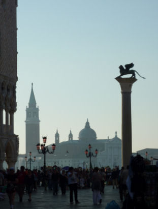 Up at 6.00am and most kindly driven to Gatwick by Jane. The old security rigmarole is much quicker than previously - I had to take my belt off, but bypassed the Random Shoe Check, or was that an advert for a new band? The flight is only a little delayed, there's the fastest passport check at Marco Polo ever, baggage is reclaimed pretty swiftly, only a few people in the queue for bus tickets, a bus waiting, the bus ride to Piazzale Roma eventless and very free from annoying people with e.g. mobile phones...this is all going too well. Find the L'Istituto Ciliota with no difficulty, check in, find room - it's spacious, and cool, and quiet. It has oodles of storage space, a big shower room, and even a fridge. Unless a heavy metal fan with a sleep problem lives opposite, or the breakfast provision is poor, I'm thinking I've struck gold here. Fingers crossed. I unpack and then go out for a wander, and boy is it hot. My decision to not pack chinos or shorts is now looking pretty darn foolish. Late lunch is the traditional slice of veggie pizza (and a can of zingy Lemon Soda) eaten sitting in Campo San Vio looking over one of the prettiest bits of the Grand Canal. Stroll up to the Salute, whose doors are wide open and beckoning, so I don't resist a short visit, and a photograph. Then it's up around the recently-reaccessible Dogana, because it's one of the classic Venetian walks, and I need to see the stupid sculpture (above right) with my owns eyes. Back along the Zattere to Nico for the first gelato - stracciatella and pear - and it's mighty fine. (With thanks to Jillian from Cambridge, who has generously sponsored the gelati on this trip - I raise my cono to her). Eat said gelato in the traditional spot opposite the San Trovaso gondola yard. Don't resist a quick visit to the church and then check out the nearby serious bookshop, weaving through the hoards of mums collecting their kids from school, and then head back to my room to write this stuff. On my way to my room I notice a machine dispensing drinks and buy a bottle of mineral water, for 50 cents! I think I'm going to like this place. Also, it may be the thick walls, but I'm hearing nobody, just the odd door closing and chair scraping, and then not loudly. Peace! A fair few mosquitoes about, mind you, and a plug-in repeller thing is provided.