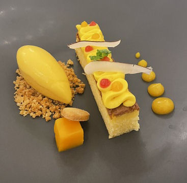 odd, and a coconut brownie with mango sorbet (see right) which was delicious. Our