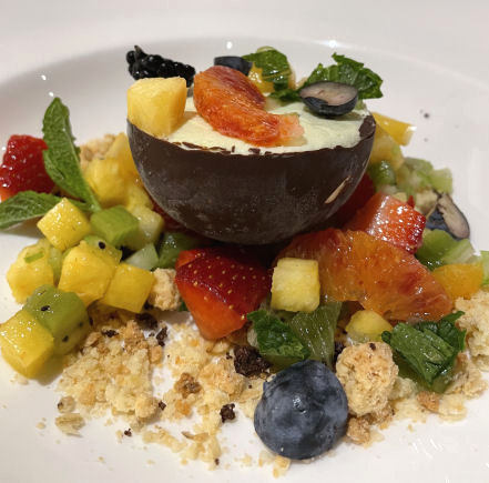 aubergine inside, on a cheesey tomato sauce. Dessert was a pile of fruit