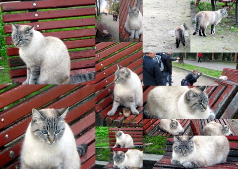 March 2008 brings an e-mail from webmeister Thomas Grones with the news that Dingo have a new web-site www.dingovenezia.it (and it works!) and that an English version is coming soon. Lucky old Gail Woodcock was in Venice again in April 2008 and writes to say: I have just returned from a few days visit to Venice and thought you would welcome an update on the cats at San Lorenzo. They were all looking reasonably well, fit and active except for the black cat without the white smudge under its chin. It seemed to have a gammy eye but otherwise it did not seem too bad. Rather than drinking the water in the blue bowl provided for them, they seemed happier drinking the rain water that had collected on the tarpaulin covering their 'home'. There was no sign of any food being left for them, but there were plenty of fat pigeons at the bridge end of the Campo feeding on bread rolls, so I guess the cats could partake of an occasional pigeon if need be. And who's to know where the rats and mice hang out locally? By the way, the green patch to one side of their home is green with grass and weeds as all the cats seem to use it 'in lieu of pussy litter'. She also attaches one of her sweet collages (right). |