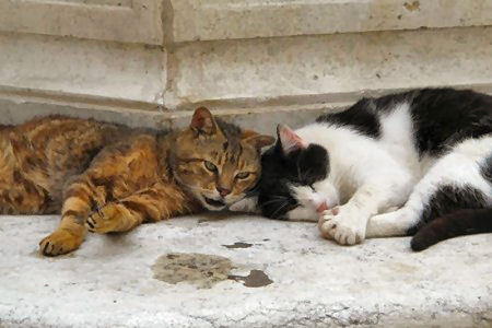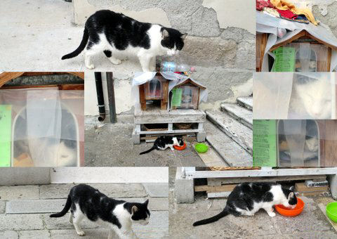 wrote: Last weekend I stayed in an apartment right next to the church on the square and can report that the cat colony is currently up to 20 cats, although around 6 hang out there during the day time. Including the cats pictured on your site - I counted 20 late at night, including the big tabby tom. A lady came at about 9am and put cat food down on paper plates and there were bowls of water (one of which was in the doorway to the building half way along on the right hand side (a school?). They all looked relatively healthy, but were very wary of people in general. They're still using the little wooden house, which still seemed quite weather-proof thankfully. I was glad to see that the locals are looking out for the cats. She also sent some photos, of the sanctuary (right) and some other local residents (below). Is the cat peering down from the wall the same cat as the rolling-over tabby tom in my photo above? |