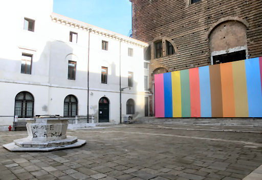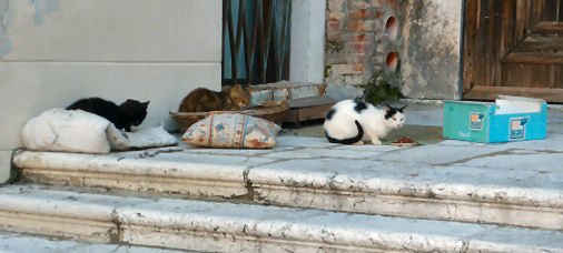 2012 A lean year for updates, and a rare non-visiting year for yours truly. But the year has seen the long-awaited and long-doubted-ever-in-our-lifetimes opening of the church of San Lorenzo. It's been granted to Mexico for use as their Biennale venue, the condition of which is that they carry out restoration. To what degree of finish and accessibility this restoration is to be carried out is to be seen. There are more photos of the church's state internally in the entry for San Lorenzo on my Churches of Venice site. The downside of this development, however, is that the Dingo huts have been reduced to one and it has been forced down the steps and off to the side, but the cats remain, as shown in these photos taken by Brigitte Eckert and (below right) Val de Furrentes. And we can now safely assume, I think, that the boss tabby photographed in past years has now gone to that bowls-of-tuna-filled campo in the sky. ![]() |