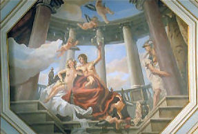 heroines enter the palazzo, go up the stairs in the courtyard, and walk