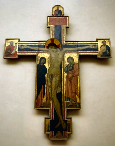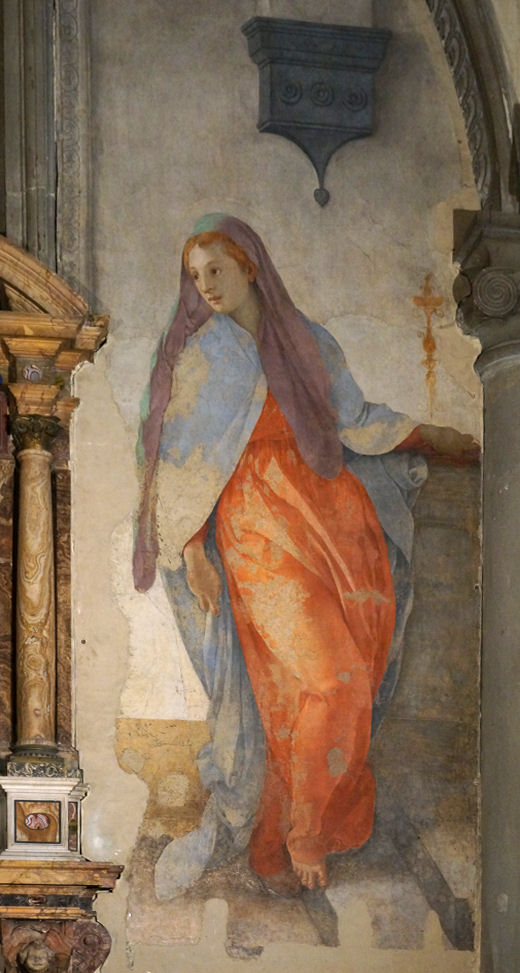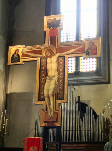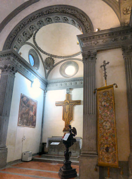 History The Augustinian convent of the Converted Women was so called because it housed nuns who were repentant prostitutes, and perhaps also young women converted from Judaism. Built in 1330 by the Compagnia delle Laudi di Santo Spirito, the convent was enlarged in 1624 by the Grand Duchess Maria Maddalena, mother of Ferdinando II. The house where St Philip Neri was born in 1515 was later attached to it. The convent was suppressed in 1808, and from 1837 has been put to various uses, mostly educational. It was deconsecrated but as there was an orthodox service in progress when I visited in 2012 (see below right) I can only assume that it has been reconsecrated. Interior The deep rear vestibule under the nun's gallery is frescoed with stories of the martyrs by Bernardino Poccetti. There's a painted ceiling by Alessandro Gherardini of the Glory of Saint Mary Magdalene, a small Brunelleschi-like arched square apse and one altar on each side of the nave. Lots of icons. Lost art ![]() Sandro Botticelli's The Trinity with Saints Mary Magdalene, John the Baptist, the Archangel Raphael and Tobias of 1491-94 (see right), the main panel from an altarpiece, now in the Courtauld Gallery in London, was probably painted for the high altar here. It needed a clean and didn't really look much like a Botticelli, suggesting considerable workshop involvement. But a recent 3-year restoration prior to the reopening of the Courtauld galleries in 2021 has seen the altarpiece's darkened varnish removed and it now looks fine. A special exhibition in 2023 will detail the restoration work. During the work it was discovered that Tobias and Raphael (depicted in miniature bottom left) were originally fully painted further away behind the cross and so in more correct proportion to the other figures. These original figures were likely the work of Filippino Lippi, then Botticelli's assistant. The altarpiece was commissioned by the Arte dei Medici e degli Speziali (the Guild of Doctors and Pharmacists) which may explain the presence of Tobias, who found a fish which cured his father’s blindness. The four panels in the predella show scenes from the Life of Mary Magdalen, an appropriate subject for the church of a convent for repentant prostitutes. The scenes are The Conversion of the Magdalen, The Feast in the House of Levi, Noli me Tangere, and The Last Moments of Mary Magdalen, and they are now in the Philadelphia Museum of Art. They were spotted in a dealer's in Florence in 1908 by Herbert Horne, a friend and associate of Roger Fry, who was then employed by the Met in New York. Spurned by the Met trustees they were bought by J.G. Johnson, whose collection later went to the Philadelphia Museum. Soon after Johnson's purchase Bernard Berenson, who'd had a falling out with Fry, told Johnson that he thought that they were not by Botticelli, but by a certain 'Amico di Sandro', an associate of Botticelli of Berenson's invention. He later changed his mind, grudgingly, but only to then say that he now thought them by Botticelli himself, but inferior works. Those guys! Carlo Portelli's Crucifix with the Virgin and Saints is in the Andrea del Sarto Cenacolo Museum at San Salvi. |