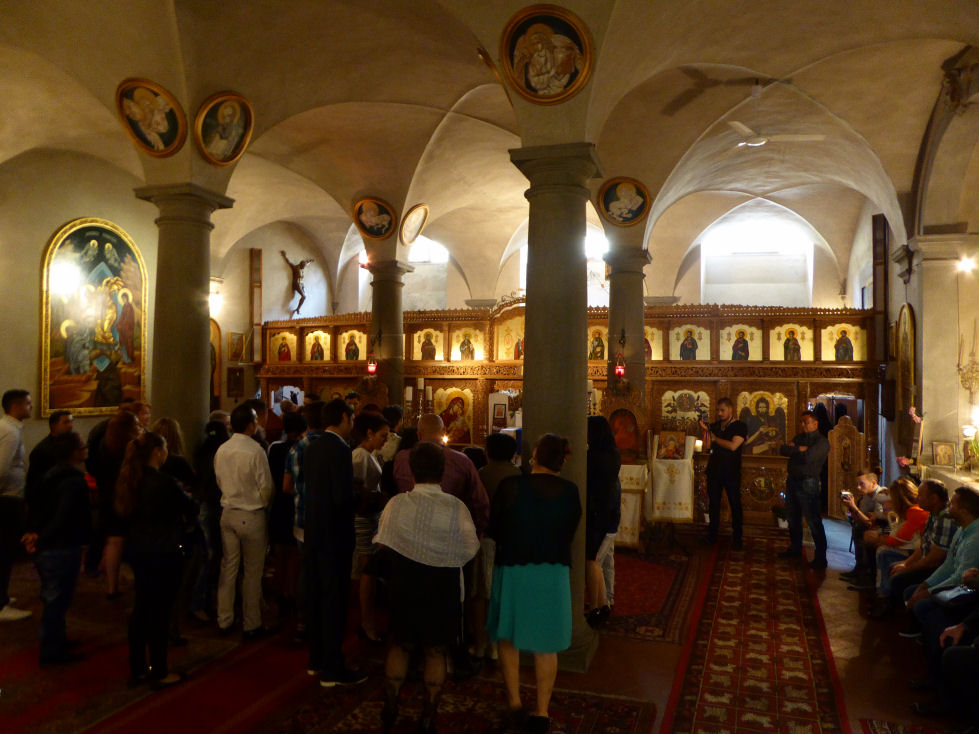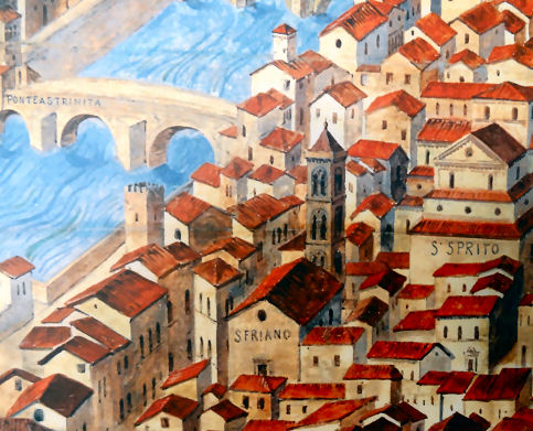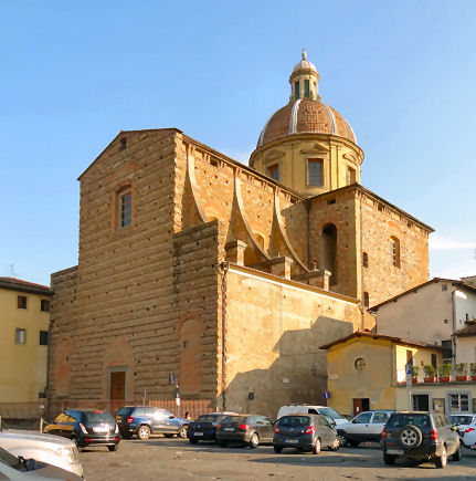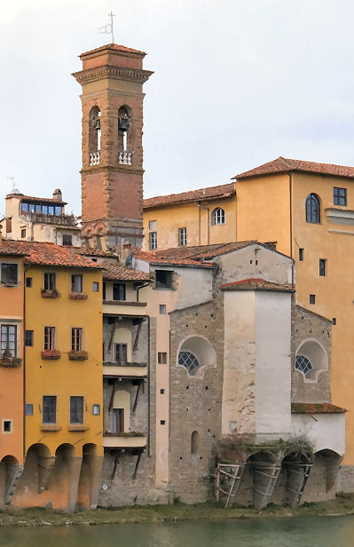 History Built in the 10th/11th centuries in a Romanesque style. According to Vasari Brunelleschi built a chapel here, the Ridolfi Chapel, the dome of which was a dry run for his famous dome on the Duomo. The chapel was destroyed during major rebuilding in the 18th century following responsibility passing to the Missionary Fathers. From 1542 the complex had been run by Franciscans. Following damage during the 1966 flood restoration work uncovered original features, including columns belonging to the original Romanesque church. The church is currently used by a Greek Orthodox congregation The façade The Romanesque portico, possibly 11th-century, was brought here from the church of San Donato a Scopeto, a church at the foot of Bellosguardo demolished in 1529 to clear ground before the siege. Interior Baroque and dating from 1709. Nice old columns and spandrels have been revealed at the sides, which complement the later and more baroque additions, rather than being covered up by them. Lots of icons around, the church currently being used by a Greek Orthodox congregation. During services expect chanting and incense, atmospheric mistiness, and bell-shaking also. ![]() Almost all of the art here dates from the 18th century rebuilding. Works by Pier Dandini (frescoes in the vault depicting Saint James), Niccolò Lapi (Moses) Matteo Bonechi (dome fresco of The Virgin in Glory with Angels) and Agostino Veracini (St. Francis of Assisi). Campanile Designed by Gherardo Silvani in 1660. Lost art Sogliani's Holy Trinity and Saints, with millions of putti, is in the Andrea del Sarto Cenacolo Museum at San Salvi. Rude locals Because of it's flying buttresses hanging over the river supporting its apse-end (see photo right) this church is popularly known as 'the church with its arse in the Arno'. |