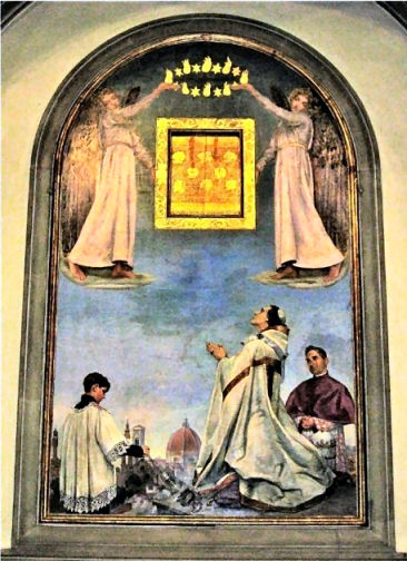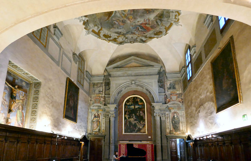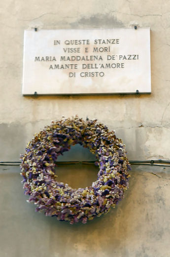 History ![]() The original church is said to have been built to celebrate a miracle performed by the 6th-century Irish saint, and Bishop of Lucca, Fridianus (Frediano). The Cistercians in residence, from whom the church derives its name, were moved to Santa Maria Maddalena in 1514 to make way for Carmelite nuns, with the patronage of the Soderini family. The Carmelite convent was called Santa Maria degli Angeli. By the time Paolo Antonio Soderini was exiled, in the mid-16th century, when the Grand Duke took over as patron, the area had become more densely populated. The Cistercians returned in 1628 when Cardinal Francesco Barberini moved the Carmelite nuns to Santa Maria Maddalena. He did this because two of his nieces, Innocenza and Grazia, were nuns here and it wasn't the nicest of areas. The Cistercians instituted rebuilding, to designs by Silvani executed by Antonio Cerutti, from 1680-1689. It was at this time that the church was moved and turned to face North, having been previously west-facing, as seen in the Catena map of 1471 (see above). The cupola and campanile were built in 1698 by Antonio Ferri, who also had a hand in Palazzo Corsini over the Arno. Following Grand Duke Leopold's suppressions of 1808 the Cistercians left and the building became a parish church. Interior Airy and two-tone white and grey, with the grey being very bluish. Aisleless, it's very 18th-century inside and quite low-key Baroque, with three deep interconnected open chapels down each side of the nave. All of them are finely frescoed in the domes, lunettes and pendentives by six Florentine painters of the late-17th and early-18th centuries, including Gabbiani, Bonechi and Dandini. The left hand ones all have lanterns in their domes, but the right hand ones rely on light from the clerestories. The transept is bare of decoration with no altars, just two pairs of wooden confessionals at each end with paintings above - the Crucifixion and the Virgin in Glory mentioned below. The impressive painting of the the Virgin in Glory in the central dome (see photo below) is by Antonio Domenico Gabbiani (1702–1718). The Four Virtues in the pendentives are by Matteo Bonechi. There's a polychrome wooden Virgin and Child by a follower of Nino Pisano, the son of Andrea, of c. 1350. Crucifixion with Saints and Martyrdom of St. Lawrence by Jacopo del Sellaio. Virgin in Glory with Saints by Francesco Curradi. Frescoes of Scenes from the life of the founder of the Cistercian order (1688–1689) by Pier Dandini. The refectory has a Last Supper by Bernardino Poccetti. In the cloisters there's a statue of Santa Maria Maddalena de' Pazzi (1726) by Antonio Montauti and St Bernard of Clairvaux defeats the devil (1702) by Giuseppe Piamontini. Lost art Jacopo del Sellaio painted a Crucifixion altarpiece in 1483 for the chapel of the Compagnia delle Brucciata in this church (see below right). It was unfinished at the artist's death and was completed by his son Arcangelo. It is a non-narrative treatment of the subject, featuring Saints Frediano and Jerome kneeling in the foreground, with small narrative scenes, including the suicide of Judas and the remorseful Peter, in the background. Around 1517/18 a terracotta lunette of the Resurrected Christ and a frame (now also lost) were commissioned from Andrea della Robbia. The altarpiece ended up in the Kaiser Friedrich Museum in Berlin and was destroyed (or stolen) in the fires and looting in the Friedrichshain flak tower (flakturm) in May 1945, where paintings from the Berlin collections were being stored to protect them from bombing. ![]() An artist nun Antonia Uccello, the daughter of artist Paolo, was a Carmelite nun here. She was a reputable artist, mentioned as such by Vasari (who described her as a 'daughter who knew how to draw') but none of her work has survived, or can be identified. Her death certificate even described her as a pittoressa. A Pazzi family nun Maria Maddalena de' Pazzi was a Carmelite nun from the Pazzi family who had lived, and died, here before the Carmelites moved to the church which now bears her name. When possessed of the holy spirit, she would speak at such a rate as took eight novices to transcribe her utterances. She was also known to pour boiling wax on her arms and lie naked in thorns. She was canonized in 1669 and is buried at Santa Maria Maddalena dei Pazzi. She is commemorated here by a plaque on he convent wall facing the street (see right). Opening times 9.30-11.30 & 5.00-6.00 |